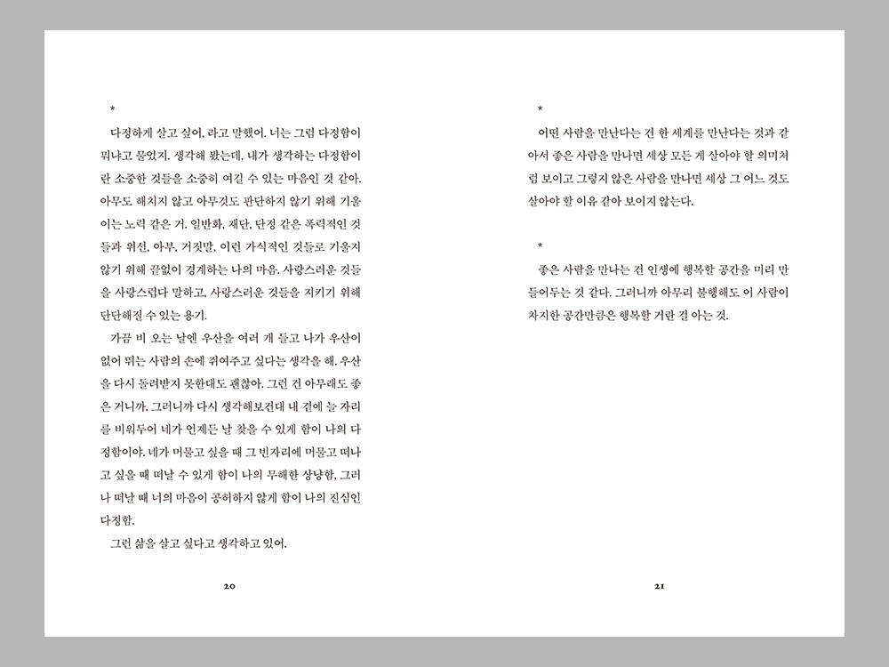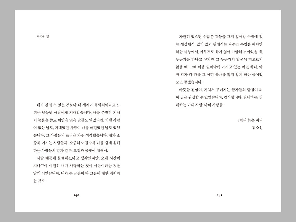 가만히 있으면 수많은 것들을 그저 잃어갈 수밖에 없는 세상에서, 잃지 않기 위해서는 자꾸만 무엇을 해야만 하는 세상에서, 아무것도 하기 싫어 가만히 누워있을 때, 누군가를 만나고 싶지만 그 누군가의 얼굴이 떠오르지 않을 때, 그때 마음 밑바닥에 가지고 있는 어떤 하나, 아마 각자 다 다를 그 어떤 하나를 잃지 않게 하는 글이었으면 좋겠습니다.