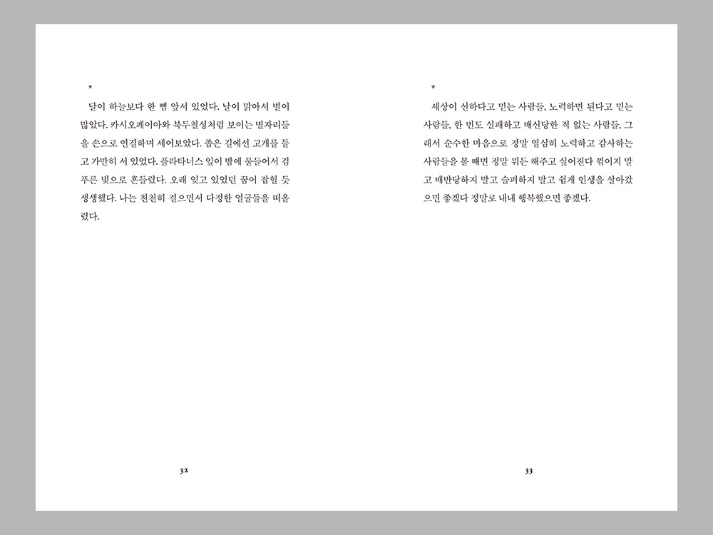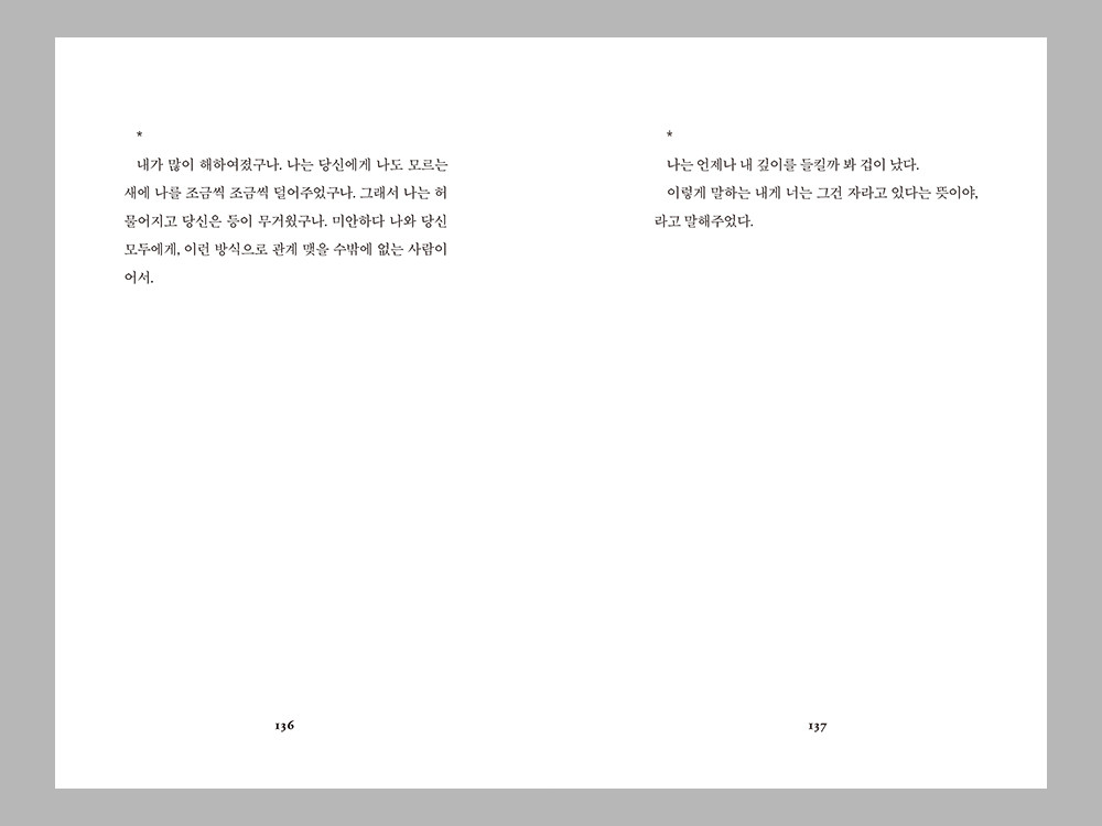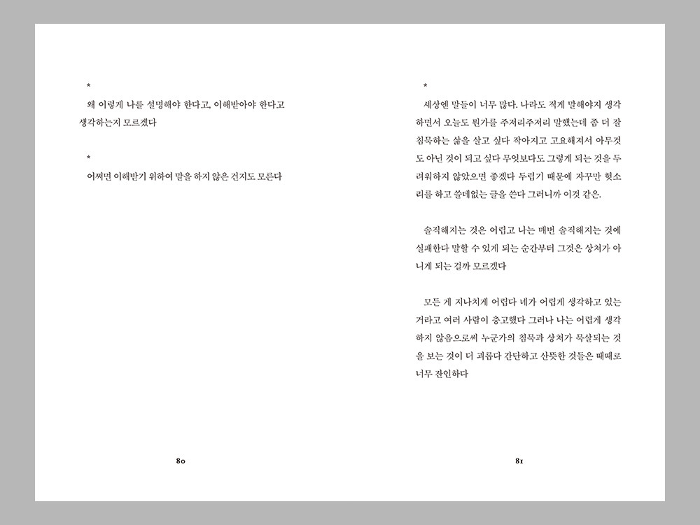 자주 사람에게 기대어 웃고 살아가지만, 사람이 주는 상처에도 쉽게 무너졌습니다. 사랑하는 사람들은 아픔과 행복을 동시에 줄 수 있고, 그 중 어느 것도 거짓이 아니었습니다. 친애하는 사람들을 사랑하면서, 동시에 친애하는 사람들이 나를 침해하는 것을 바라보면서 쓴 글입니다.