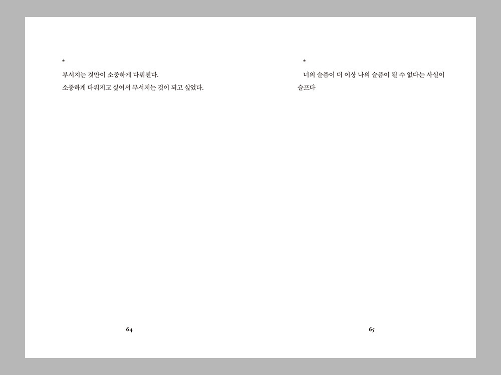 “부서지는 것만이 소중하게 다뤄진다. 소중하게 다뤄지고 싶어서 부서지는 것이 되고 싶었다.”