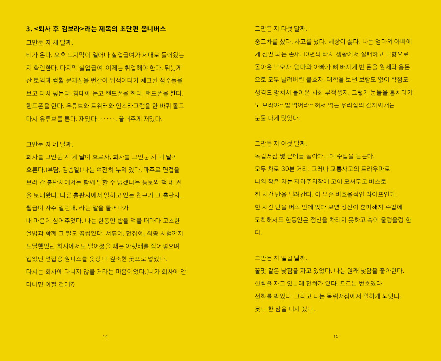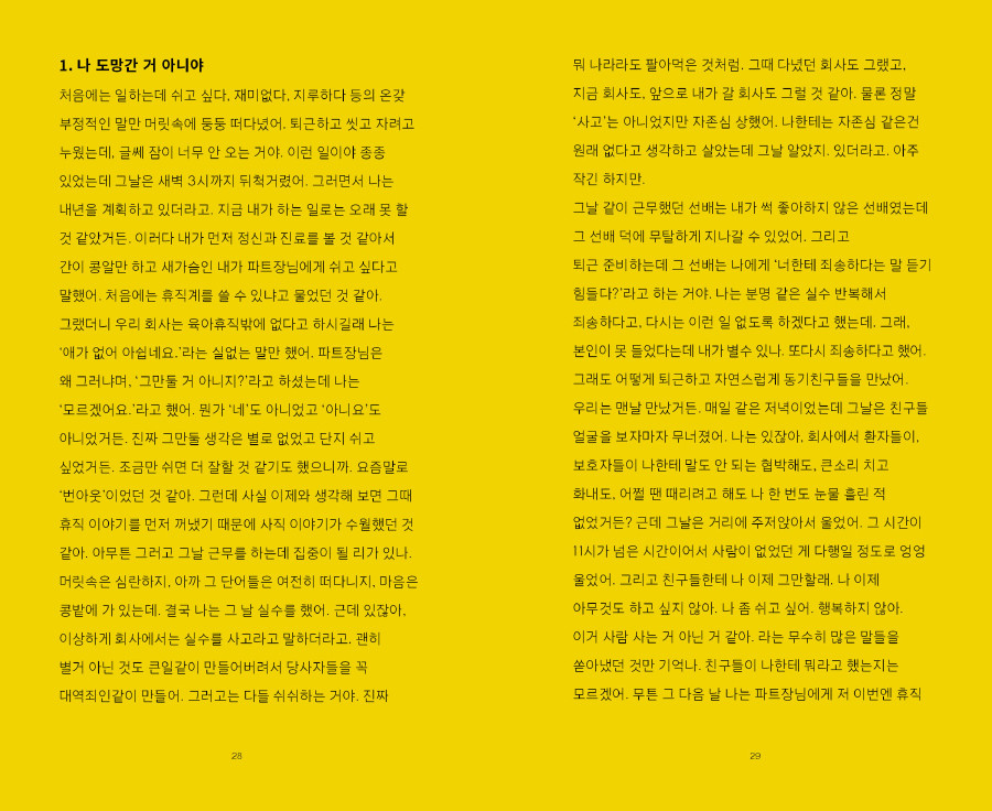 네모난 책상에 둘러앉아 쏟아놓은 회사와 퇴사에 얽힌 애잔하고 희망찬 에피소드들을 엮은 독립출판물입니다.