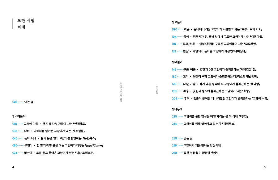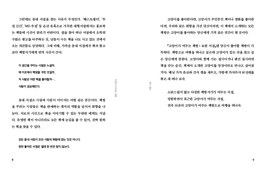 고양이와 책방이 따뜻하게 오랫동안 함께 할 수 있도록, 책방과 고양이가 함께 공존하는 이 거리를 유지할 수 있도록. 고양이의 위로가 필요한 당신이 찾아갈 책방이 사라지지 않도록, 고양이를 좋아하는 당신이 지켜줘야 할 16곳의 책방과 그 고양이들을 소개한다.