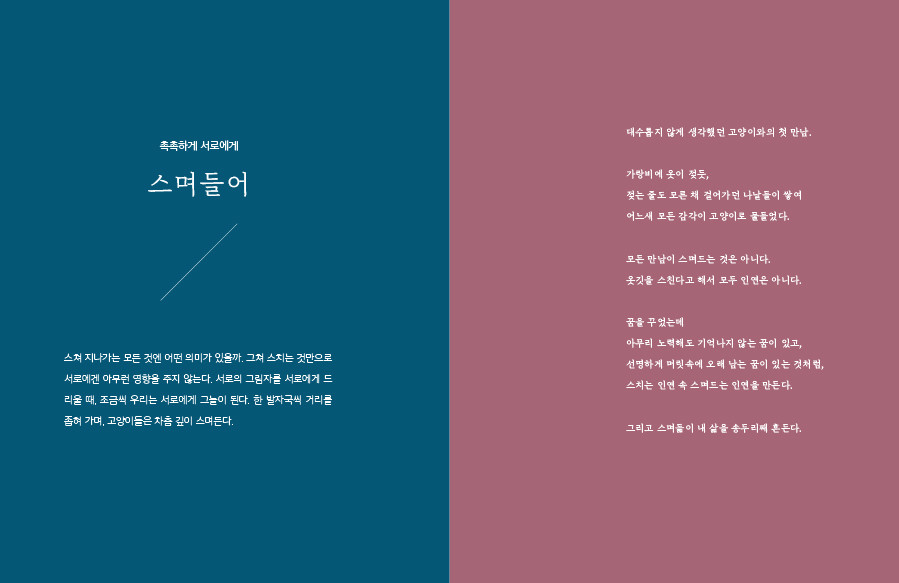 고양이는 ‘야옹’이라는 한마디만 했을 뿐인데, 우리는 야옹이라는 말속에서 수많은 의미를 찾는다. 고양이가 와서 ‘쓱’ 비비고 갔을 뿐인데, 우리는 고양이의 모든 것을 사랑할 준비를 한다. 고양이가 내 곁에 그저 머물렀을 뿐인데, 우리는 어느새 밥을 주고 물을 주며, 대화를 건다. ‘고롱고롱’ 고양이가 돌리는 행복 엔진 소리를 들었을 뿐인데, 우리는 어느새 차분해지고 위로를 받는다. 고양이가 자려고 ‘꾹꾹이’를 했을 뿐인데 우리는 고양이에게 사랑받는다며 뿌듯해한다.