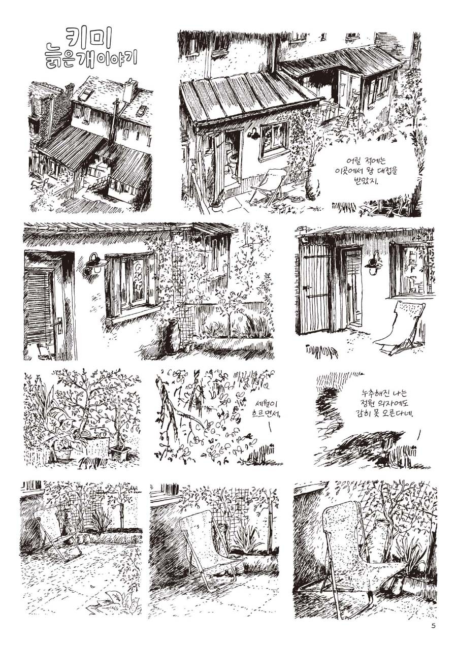 프랑스 만화가 닐소는 독립만화라는 말도 흔치 않았을 때부터 작은 서점을 거점으로 꾸준히 그림책-만화책을 그려왔습니다. 그림을 그리기 전에는 서핑에 미쳐 있는 활기찬 젊은이였고, 지금은 무수한 선을 긋는 나이 지긋한 만화가로 살고 있습니다. 그는 펜으로 무수한 선을 만들어낼 때면 단순하고 더없이 평온한 기분이 된다고 합니다. 가는 선을 더하면 어둠과 깊이가 생기고 선을 절제하거나 쓰지 않으면 빛과 여백이 만들어지는 명료한 세계 속에서요. 이런 명상과도 같은 드로잉을 멈추게 되는 시간이 만화가에게도 분명 있습니다. 배를 채우거나 잠을 자는 시간, 일상인으로 충실해야 하는 주말 같은 때에는 선을 긋지 못해 조금은 우울하고 복잡한 마음이 됩니다. 이럴 때 생각한 무척 진지한 이야기가 나이 든 개의 마지막 여정이었어요. 하지만 역시 막상 키미를 그리다 보니 선을 더하는 동안 즐겁고 장난스러운 기분이 회복되고 말았죠. 그래서 키미의 혼자 하는 만담 같은 우스갯소리, 대화랄 만한 정다운 대화, 음식이랄 만한 접시에 담긴 음식 역시 이 작품에는 들어 있습니다.