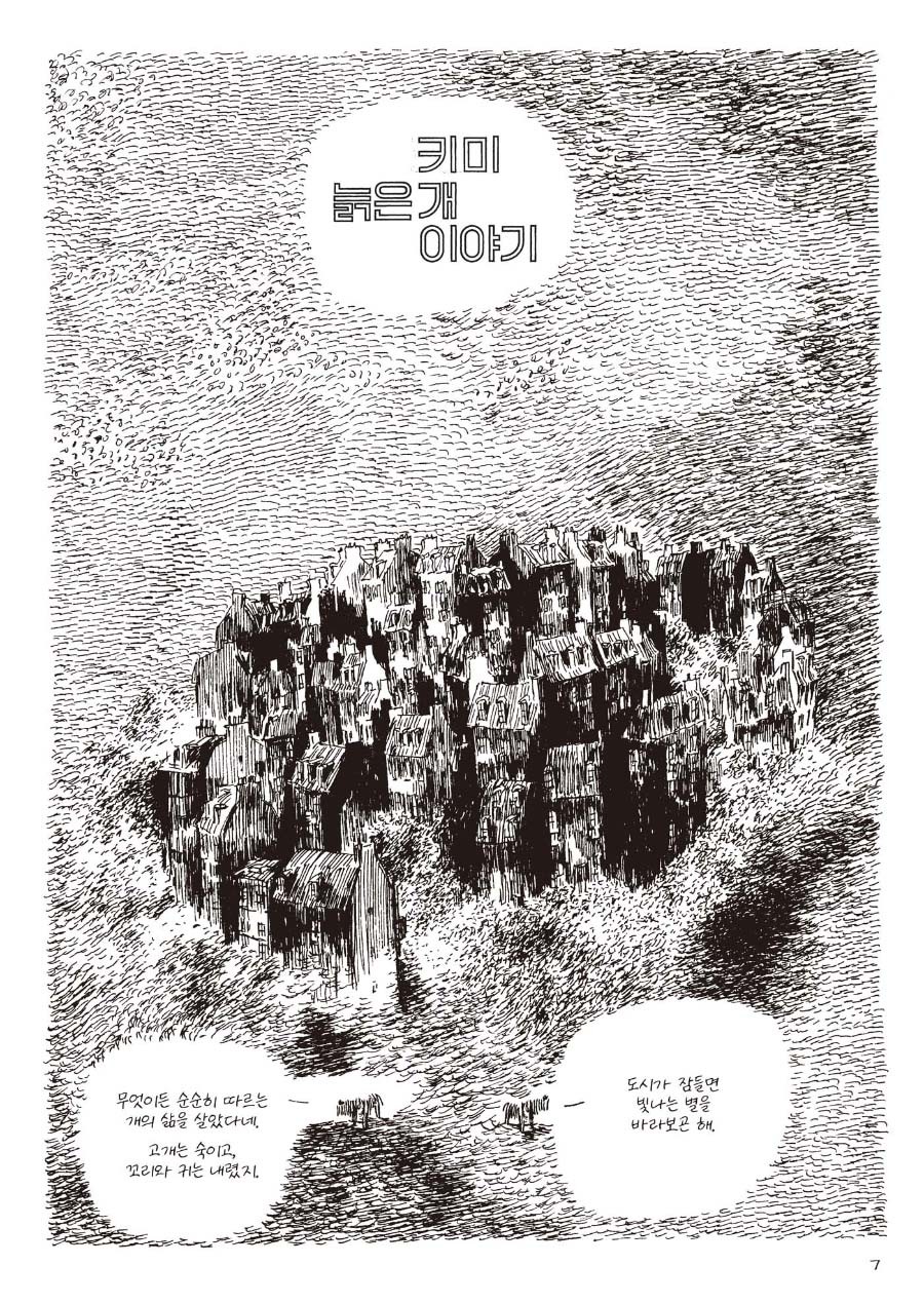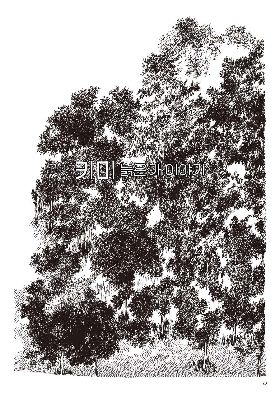 늙은 개의 이야기를 들어보시겠어요? 소낙비처럼 쏟아지는 까만 선들 속에서, 작고 단순하게 빛나는 키미를 찾아보세요.