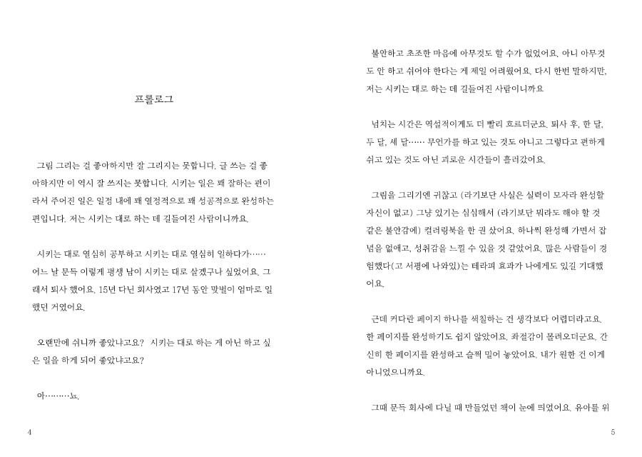 넘치는 시간은 역설적으로 더 빨리 흘러가더군요. 귀찮은데 심심하기는 하고, 무언가를 하고 싶은데 막상 아무것도 해낸 것은 없는 애매한 시간이 흘러갔어요. 잡념을 없애고 집중하면서 성취감을 느끼고 싶어 산 컬러링북은 한 페이지를 완성하는 것도 쉽지 않았어요. 좌절감이 몰려 오더군요.