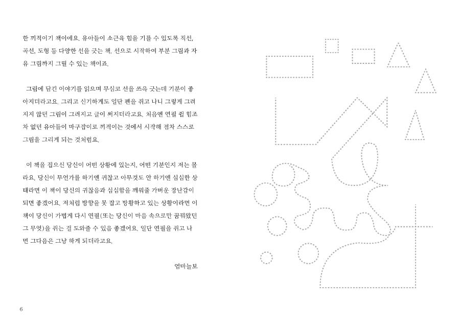 그러다 문득 쥐게 된 유아용 선긋기 책. 그림에 담긴 이야기를 읽으며 무심히 선을 쓰윽 긋는데 기분이 좋아지더군요. 일단 펜을 쥐고 나니 신기하게도 그림이 그려지고 글도 써졌어요. 연필 쥘 힘조차 없던 유아들이 끼적이기로 시작해 선을 긋고 그림을 그리게 되는 것처럼요.
