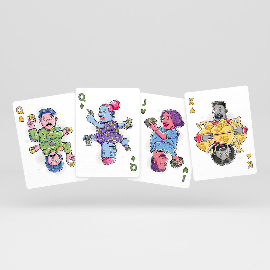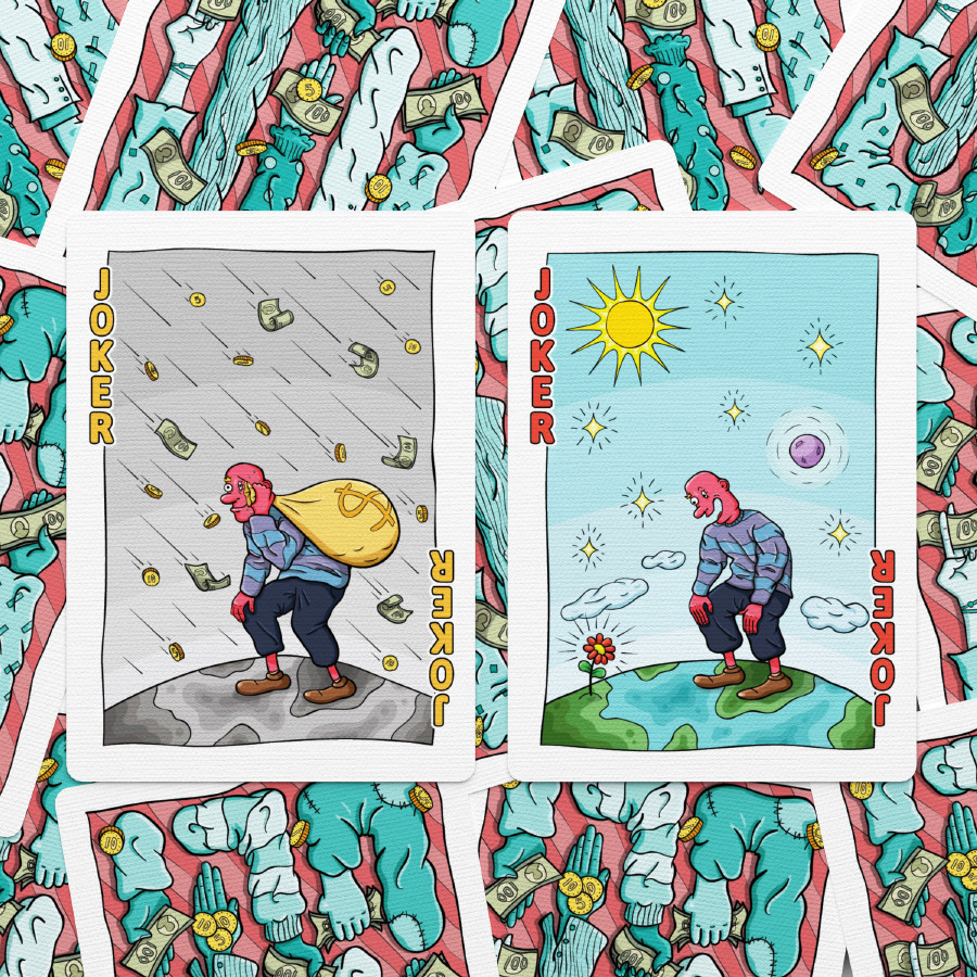 돈에 울고 돈에 웃는 사람들 또 돈의 양에 따라 등급이 나눠지는 다소 우울한 사람들의 모습이 독특하고 개성있는 그림체와 밝은 색감으로 표현되어 있습니다. 조커카드에는 다른 카드들과는 다르게 꽃 한송이를 보며 웃고 있는 사람이 표현되어 있습니다.