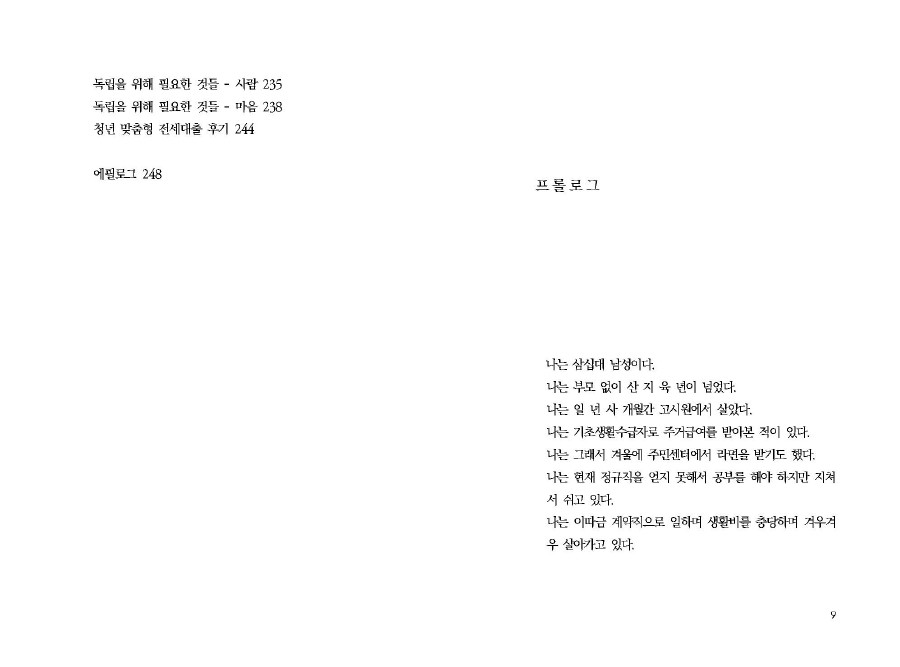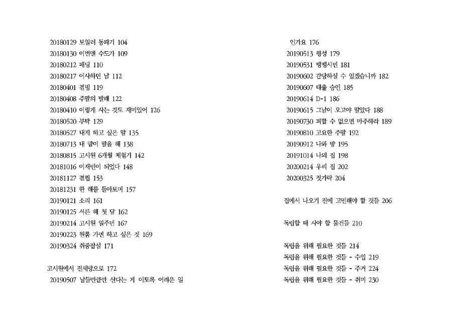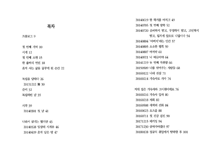 홀로 돈을 벌어 스스로 집을 꾸려 살아가는 것은 어려운 일이 된 지 오래다. 하지만 대학 진학과 취업으로 인해, 또는 가족과의 갈등 때문에 독립을 생각하는 이들이 늘어나고 있는 현실. 이들에게 독립은 낭만적인 일처럼 느껴질 수 있겠지만, 사실은 고민에 고민을 거듭해야 하고 어쩌면 고통스러울 수도 있는 것이 바로 독립이기도 하다. 무일푼으로 시작해 원룸, 기숙사, 그리고 고시원을 넘나들며 느낀 것을 풀어쓴 수필과 독립을 하고자 하는 이들에게 알려주고자 하는 팁이 모두 담긴 한 청년의 독립 분투기.