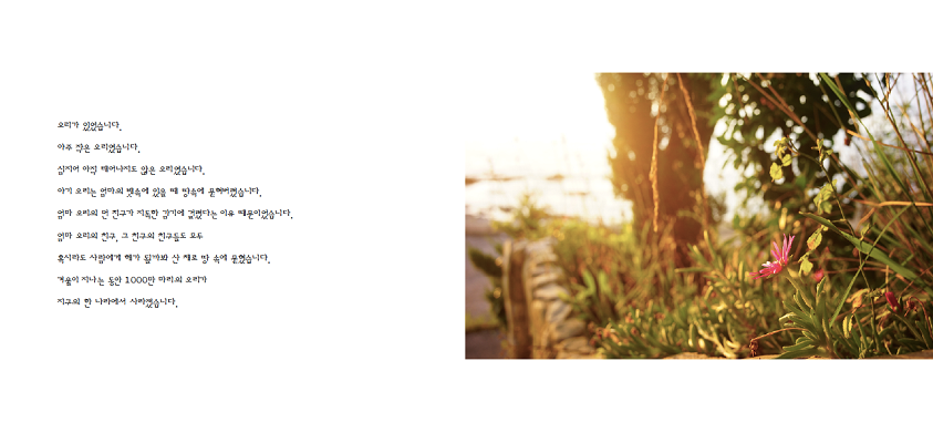 이 이야기를 순차적으로 사진과 동화의 형태에 실어 전달하고자하는 것이 바로 <오리의 여행> 시리즈입니다.