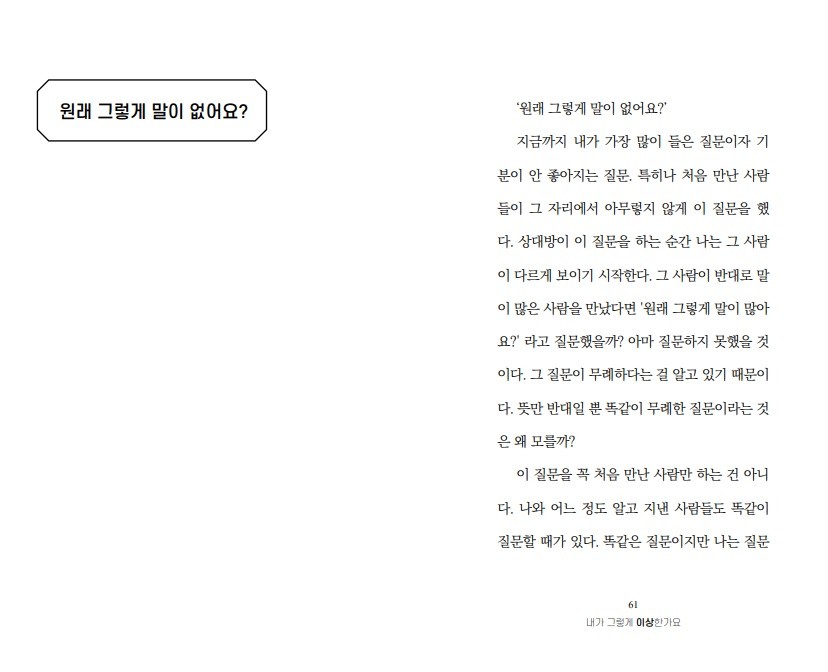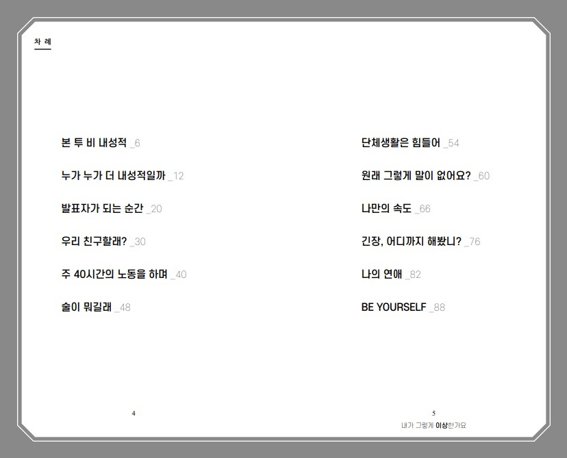 내성적인 성격으로 살아가면서 저자가 겪었던 일들, 그리고 느낀 점들에 대한 에세이.