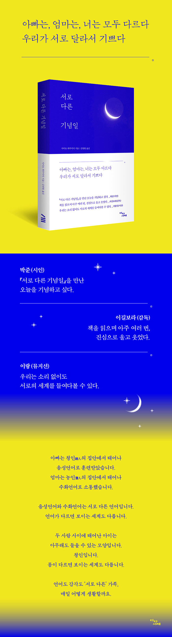 가족은 서로의 숨결을 알아차리기 위해 매일 밤 나란히 몸을 포갠 채 잠든다. 듣지 못하지만 서로를 더 보고 더 느끼기로 한다. 저자는 아이에게 서로가 다르다는 걸 처음 알린 날을 “서로 다른 기념일”로 정하고 “우리가 달라서 기쁘다”고 고백한다.