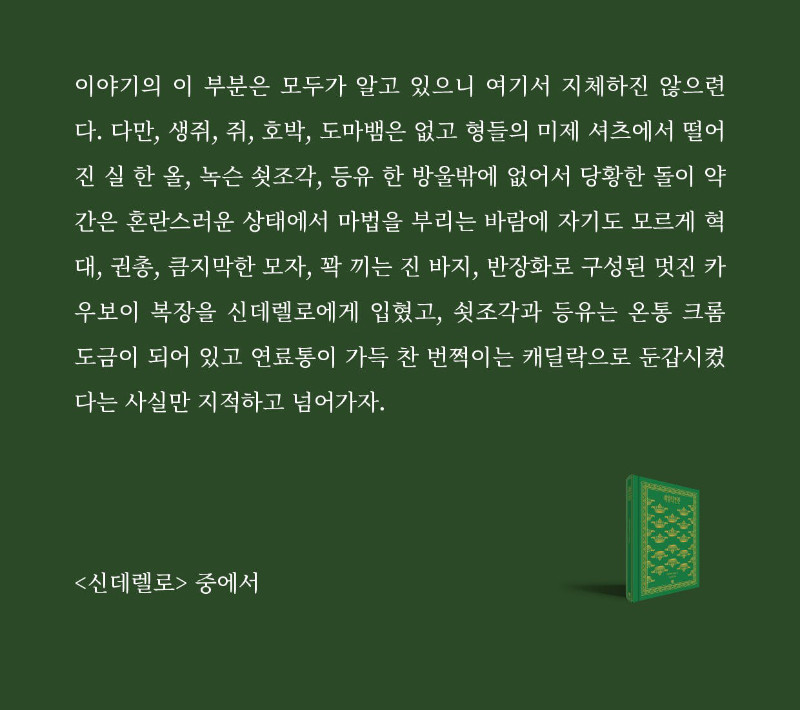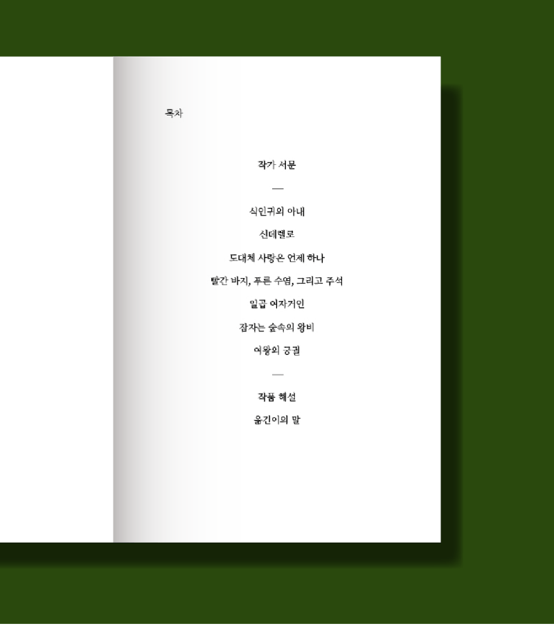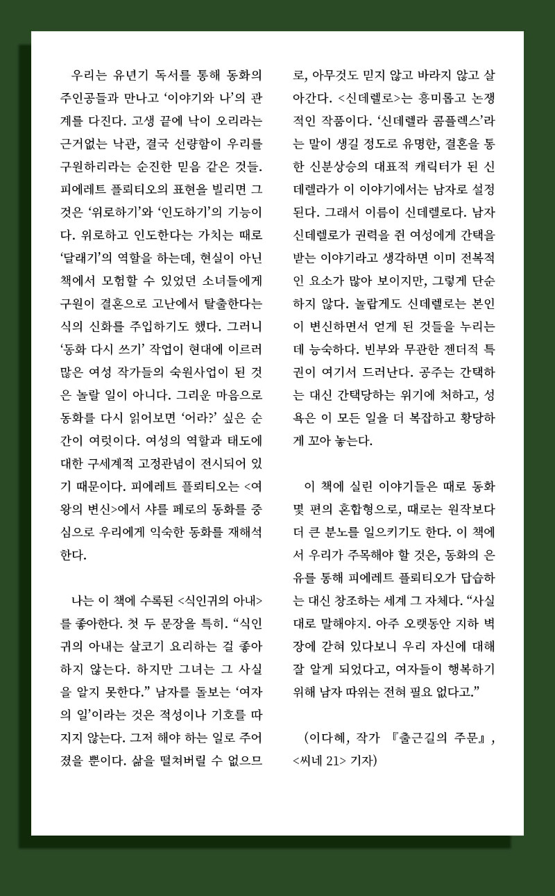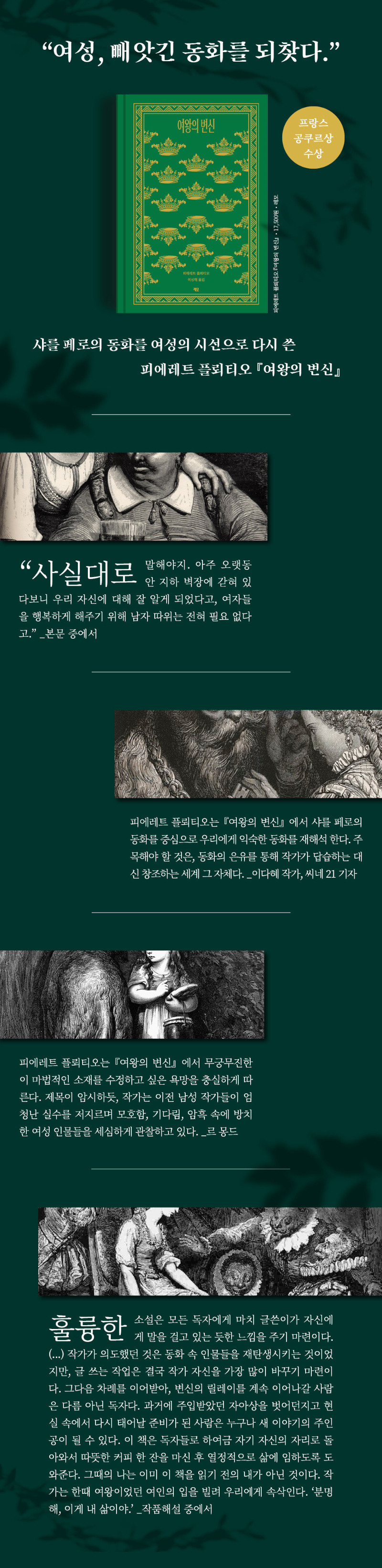 『여왕의 변신』은 <신데렐라>, <백설 공주>, <푸른 수염>, <잠자는 숲속의 공주>처럼 우리에게 친숙한 옛 동화에 페미니즘 요소를 더해 현대적으로 다시 풀어낸 소설집입니다. 작가의 상상력이 한껏 발휘된 이 책에서, 왕자를 기다리는 수동적인 여성의 모습은 절대 찾아볼 수 없습니다. 그렇다고 뻔하디뻔한 동화 비틀기는 아닙니다. 조금은 낯설고 기괴한 방식으로 새롭게 읽는 재미와 쾌감, 새로운 여성 서사를 경험하게 됩니다. 또한 곳곳에 숨겨진 유머는 이 책의 또 다른 미덕입니다.