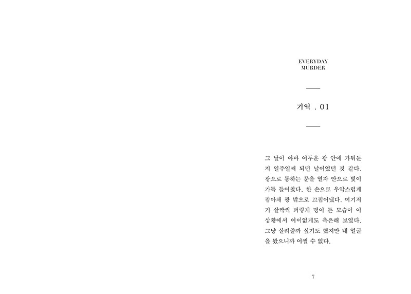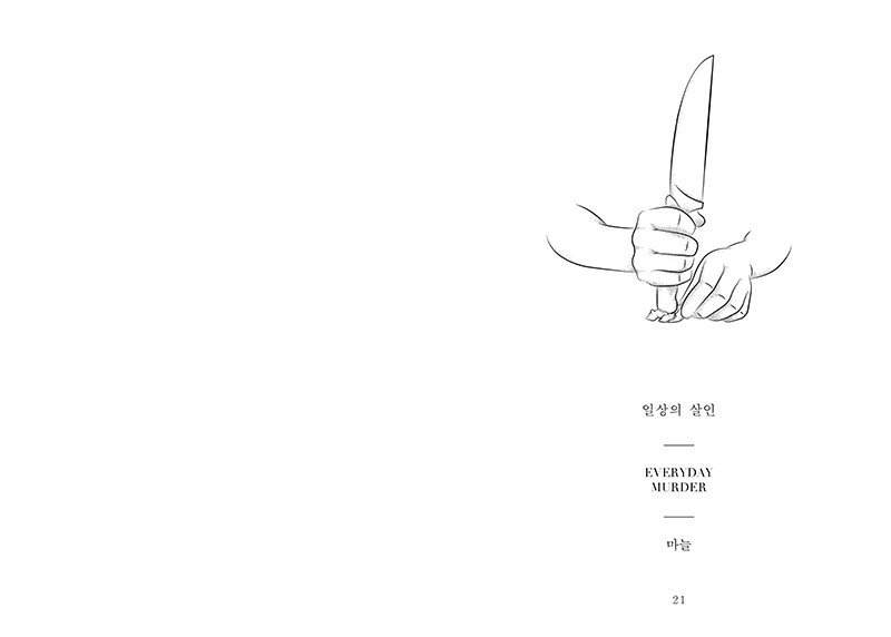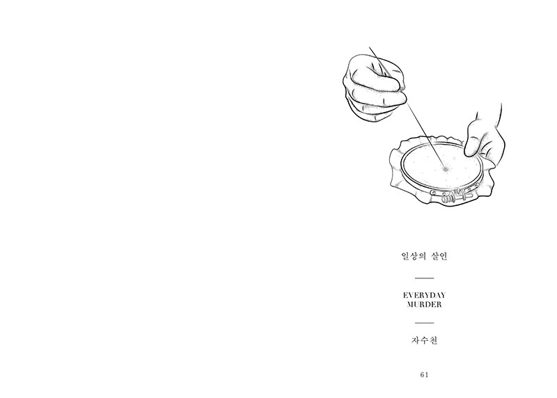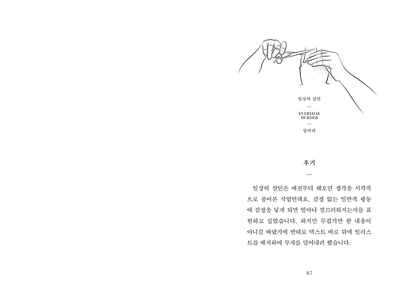 『일상의 살인』은 개성 있는 독립출판물로 화제가 되고있는 우세계의 일러스트 에세이다. 일상적인 행동에 감정을 넣어 그 순간을 긴장되고 잔인한 순간으로 만들어버린다. 글에 몰입하여 읽다가 일러스트를 만나게 되면 안도의 미소를 짓게 된다. 그리고 다시 긴장되고 웃음이 번지는 스무 번의 상황이 반복된다. 귤껍질, 발포 비타민과 같은 일상의 사소한 파편들 속에서 섬찟한 폭력과 아름다움을 동시에 찾아낸다. 텍스트와 이미지가 반복되는 구성 속에서 흥미로움도 배가 된다. 『일상의 살인』은 사람과 사물 사이에 형성된 팽팽한 긴장감을 느끼는 동시에 어떤 사물의 이야기인지 상상하며 읽는 즐거움도 함께 선사할 것이다.
