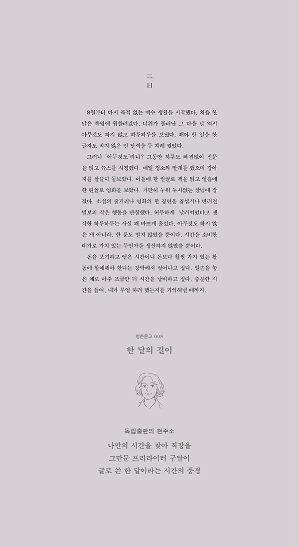 출판편집자로 일하면서 ‘내가 읽고 싶은 글’, ‘내가 읽고 싶은 책’에 대해 고민하다가 독립출판에 대해 알게 됐다. 그 후 바쁜 직장 생활 틈틈이 글을 쓰고 그림을 그리고 사진을 찍으며 블라디보스토크, 하라쇼 고독한 외식가 일개미 자서전 등 다양한 독립출판물을 펴냈다. 지금은 글을 쓰는 데 좀 더 많은 시간을 투자하기 위해 직장을 그만두고 반려견을 돌보며 근면한 프리라이터로 하루하루를 보내고 있다.