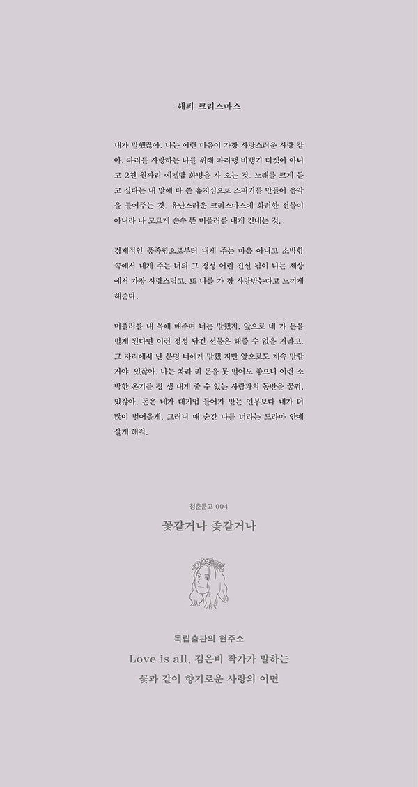 사랑에 대한 진솔한 표현으로 많은 독자층을 형성한 김은비의 두 번째 시집 『꽃같거나 ㅈ같거나』는 그녀가 연애하며 느꼈던 감정과 에피소드를 그대로 담았다. 김은비는 사랑이 매일 꽃과 같이 달콤하고 향기로울 것만 같다는 독자들의 환상을 가감 없이 깨버린다. 오히려 연애할 때 상대방을 어떻게 사랑하고 있는지에 대한 물음을 던진다. 이 물음은 사랑을 가벼이 생각하는 이 시대에 사랑의 의미에 대해 고민해보는 계기가 될 것이다.