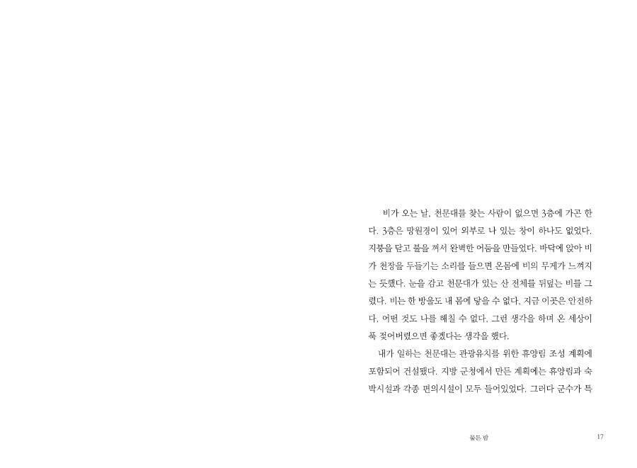 "바닥에 앉아 비가 천장을 두들기는 소리를 들으면 온몸에 비의 무게가 느껴지는 듯했다.