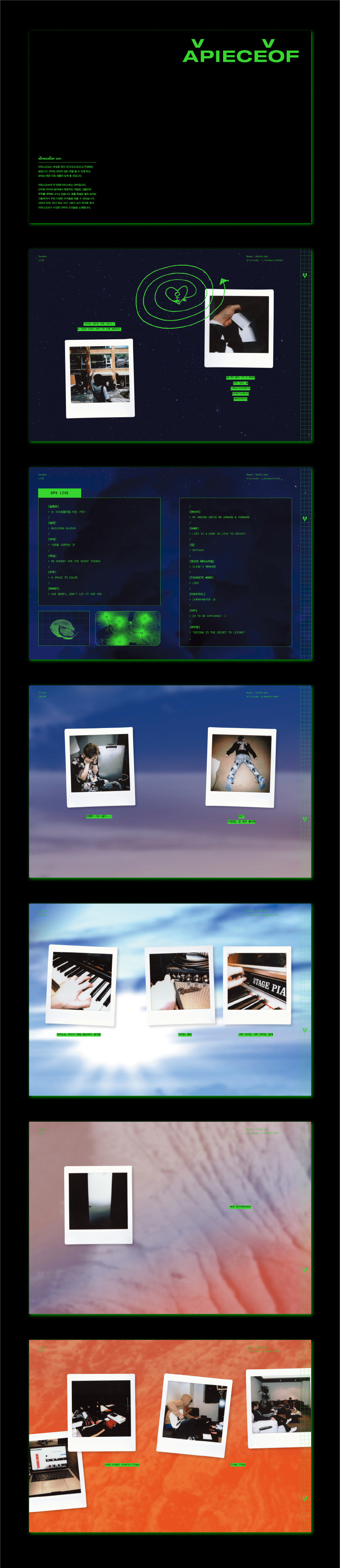 우리는 그들에게 카메라를 건넨 뒤 내면과 외면, 꿈과 현실이 이어지는 순간을 촬영하고 기록하도록 하였습니다. 그들의 시선은 또 다른 언어라고 생각했습니다. 시선이라는 언어를 전달해주는 사진을 통해 그들의 조각을 바라봅니다. 어피스오브 vol.2는 DPR 멤버 각자가 자신의 어떤 조각들을 마주하고 우리와 커뮤니케이션 했는지에 대한 기록물을 전시한 책입니다.