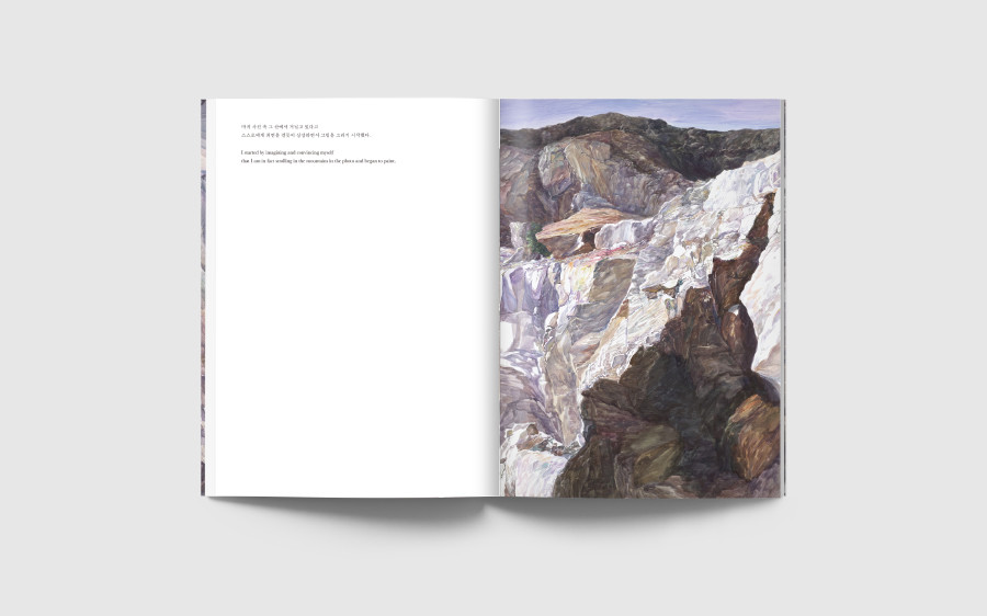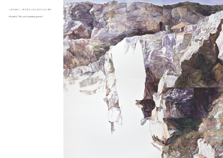 사진 속 그 산에 가면, 내가 알지 못했던 먼 나라의 산에 오르면 느껴질 것만 같은 설레는 기분을 불러일으키며 그림 속에 산을 만들어나갔다. 그곳에 직접 가 보았던 M은, 그곳에 한번도 가본 적 없는 내가 그려내는 그림을 보는 것을 재미있어 했다. 나는 내가 상상하며 그리고 있는 그곳의 실제 경험자인 M에게 그림을 보여주며 감상을 듣는 것을 좋아했다. M에게 네가 보내준 산 사진을 이렇게 그리고 있다고 했다. 그러자 M은 그 ‘채석장’을 그리고 있구나, 라고 했다. “채석장 사진이었다고? 나는 산 사진인 줄 알았어.” 라고 말하는 순간 채석장도 산이잖아, 하는 생각이 바로 따라붙었다. 산을 깎고 캐내면 그곳을 채석장이라 부르니까. M이 보내준 사진은 어느 부분을 보느냐에 따라 그곳을 산이라고 부를 수도, 채석장으로 부를 수도 있었다. 내가 그리고 있던 이 산이 채석장이라면, 내가 지금 붓을 스치며 만들고 있는 부분이 실제로는 깎여나가 사라지고 있을지 모른다는 생각이 들었다.