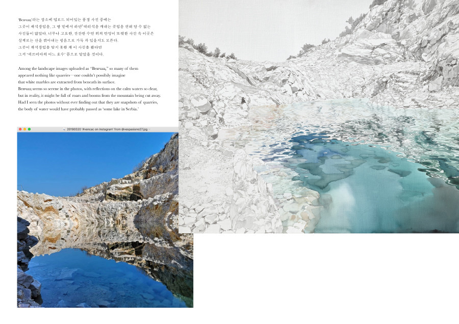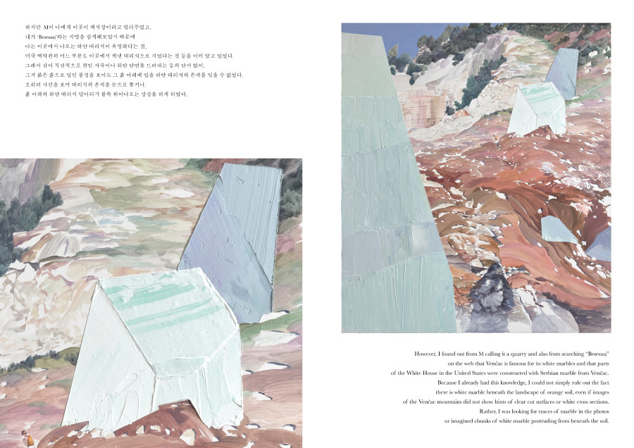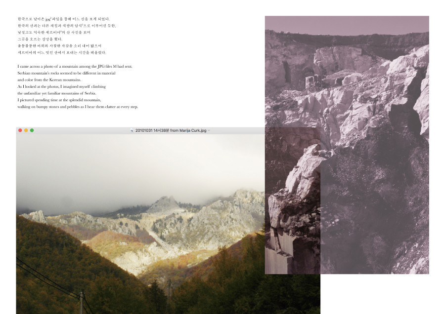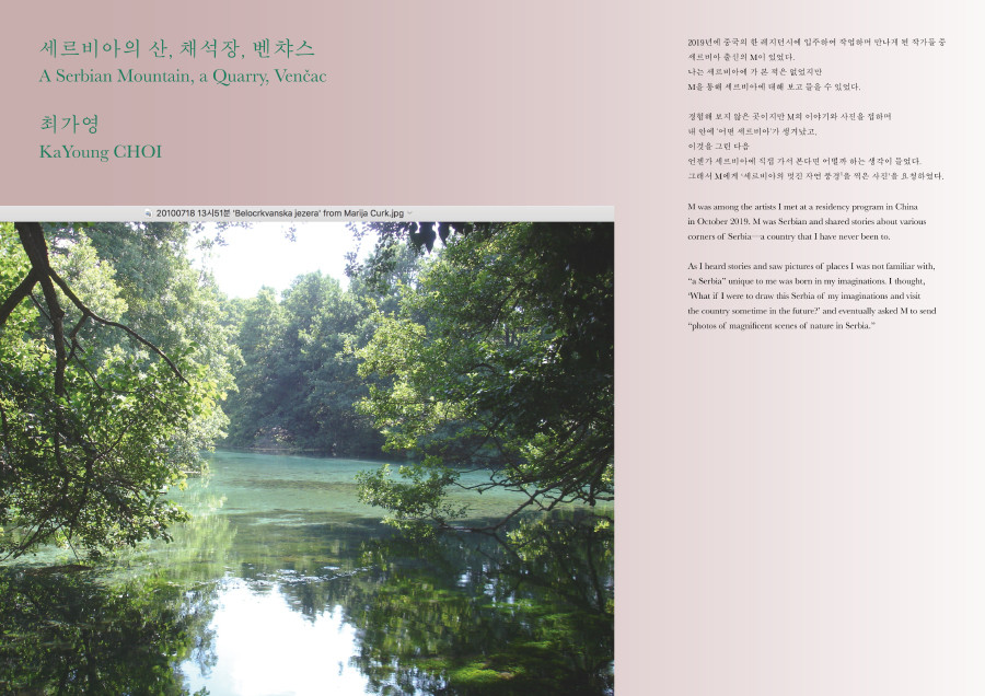 2019년에 중국의 한 레지던시에 입주하여 작업하며 만나게 된 작가들 중 세르비아 출신의 M이 있었다. M을 통해 나는 한번도 가보지 않은 세르비아라는 나라의 이곳 저곳에 대해 들을 수 있었다. 경험해 보지 않은 곳에 대한 이야기와 사진들로 나에게 ‘어떤 세르비아’가 생겨났고, 이것을 그린 다음 언젠가 세르비아에 직접 가서 본다면 어떨까 하는 생각이 들었다. 그래서 M에게 ‘세르비아의 멋진 자연풍경을 찍은 사진’을 요청하였다.