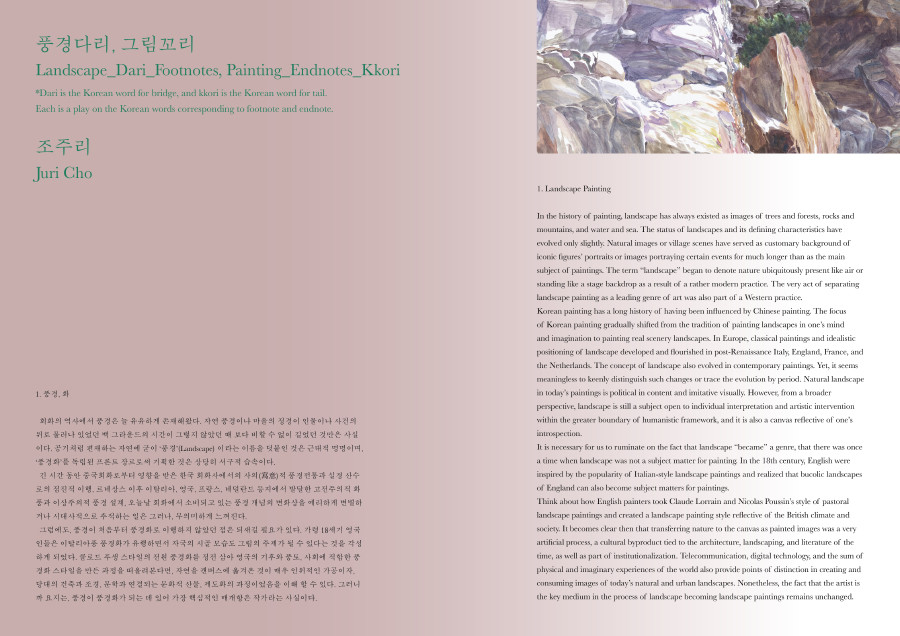 그리고 이렇게 그곳에 대해 알아가고 더 많은 사진들을 볼 수록, 그곳은 애초에 내가 상상했던 ‘세르비아의 산’과 점점 더 멀어져 갔다. 그렇게 그림은 실제와 멀어져 갔고 결국 나의 그림은 어디에도 없는 곳에 대한 사생이 되었다. ‘실재하는 장소의 사진을 보고 어디에도 없는 곳을 그렸다’ 는 점과 ‘어디에도 없는 곳을 상상하며 언젠가 직접 경험해보기를 꿈꾸었다’는 점에서 발생한 경험, 인식, 이상, 평면, 회화에 대한 생각들이 작업들을 이끌었다. 직접 경험하지 않은 어떤 것에 대한 시각적 체험에 개입하는 선입견과 상상은 실재하지 않는 것을 경험하게 하기도 하였다. 보이는 대로 생각하고 생각하는 대로 보이는 이미지가 만들어낸 그림 속 공간은 세르비아에 가더라도 볼 수 없을 것이다.
