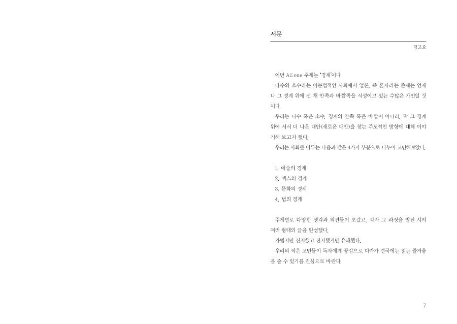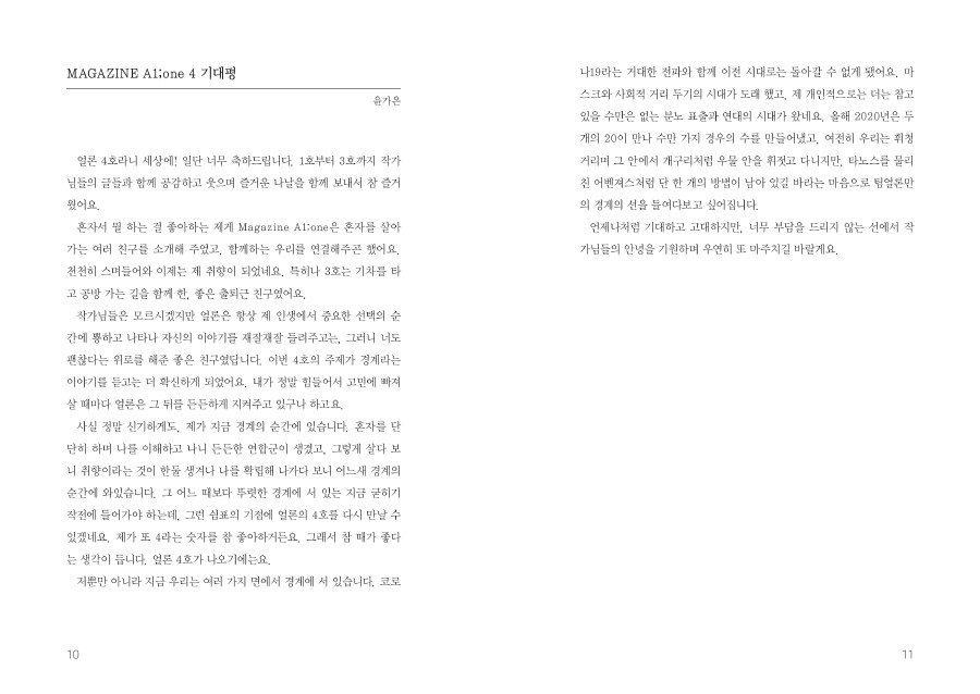 혼자(나)를 이야기하는 문예지 《A1;one》(매거진얼론) 의 네 번째 결과물입니다.