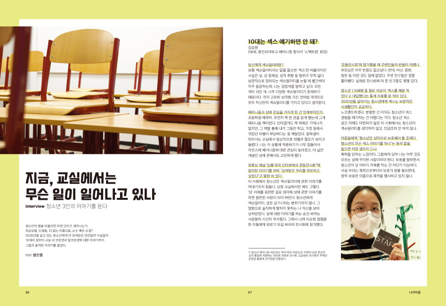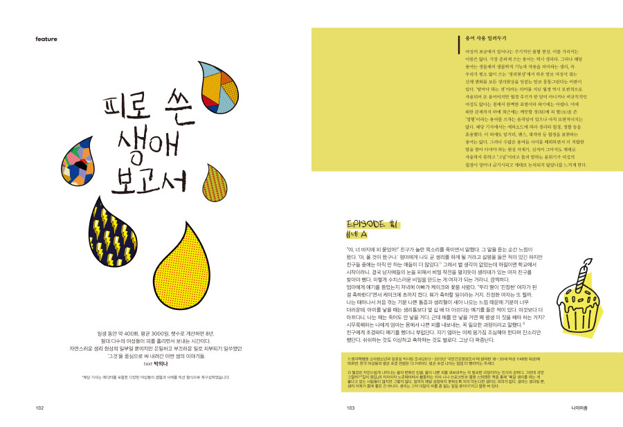 스페셜 섹션에서는 여성의 몸에 집중해 보았습니다.여성은 ‘젊고 건강한 몸’이라는 기본값에 ‘아름다움’이라는 또 하나의 조건을 부여받습니 다.그로 인해 끊임없이 대상화되고, 수많은 폭력과 검열에 노출되는 여성의 몸에는 어떠한 생의 역사들이 새겨져 있을까요? 여성의 몸으로 무사히 나이들 수 있는 세상을 바라며 우리의 현실과 고민을 담아 보았습니다.