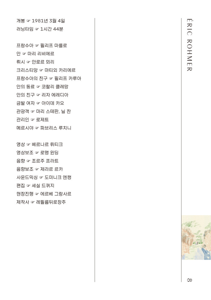 단순한 하나의 격언에서 풀려나가는 복잡다단한 사고와 감정의 폭풍에 자연스럽게 머리와 몸을 맡겨보세요. 지난세기 한적하거나 붐비는 어느 해변, 계절의 풍광이 온몸으로 흡수되는 한때, 머릿속과 마음속을 휘젓는 감정들의 파동을 하나의 격언으로, 한 권의 책으로 읽는 독서의 사치와 평온을 누릴 수 있습니다. 100분을 상회하는 장편영화로 발전할 수 있을 정도의 한 문장을 써낸, 인생의 본질을 과감하게 축약해낸 통찰가들의 이름에는 시인 랭보도 있고, 우화작가 라퐁텐도 있습니다. 그리고 “아무것도 생각하지 않을 수는 없다.”는 에릭 로메르가 직접 쓴 격언입니다. 오늘 하루만 해도 우리가 아무 생각도 하지 않은 순간이 있던가요. 혹은 아무것도 아닌 것을 생각할 수 있던가요. 이 알쏭달쏭한 질문을, 로메르의 영화를 들여다보기 전까지는 알쏭달쏭하게 느끼는 일도 드물지요. 아무렇게나 지나쳤을, 지나치고서도 아쉬움 한 조각 남기지 않았을, 아주 작고 절묘하게 벼려진 반짝이는 칼날을 주워들게 되는 기쁨을 이 조그마한 책에서 경험하시길 바랍니다. <희극과 격언> 영화 연작 여섯 편을 발표년도에 따라 세 편씩 나누어 두 권으로 소개합니다.