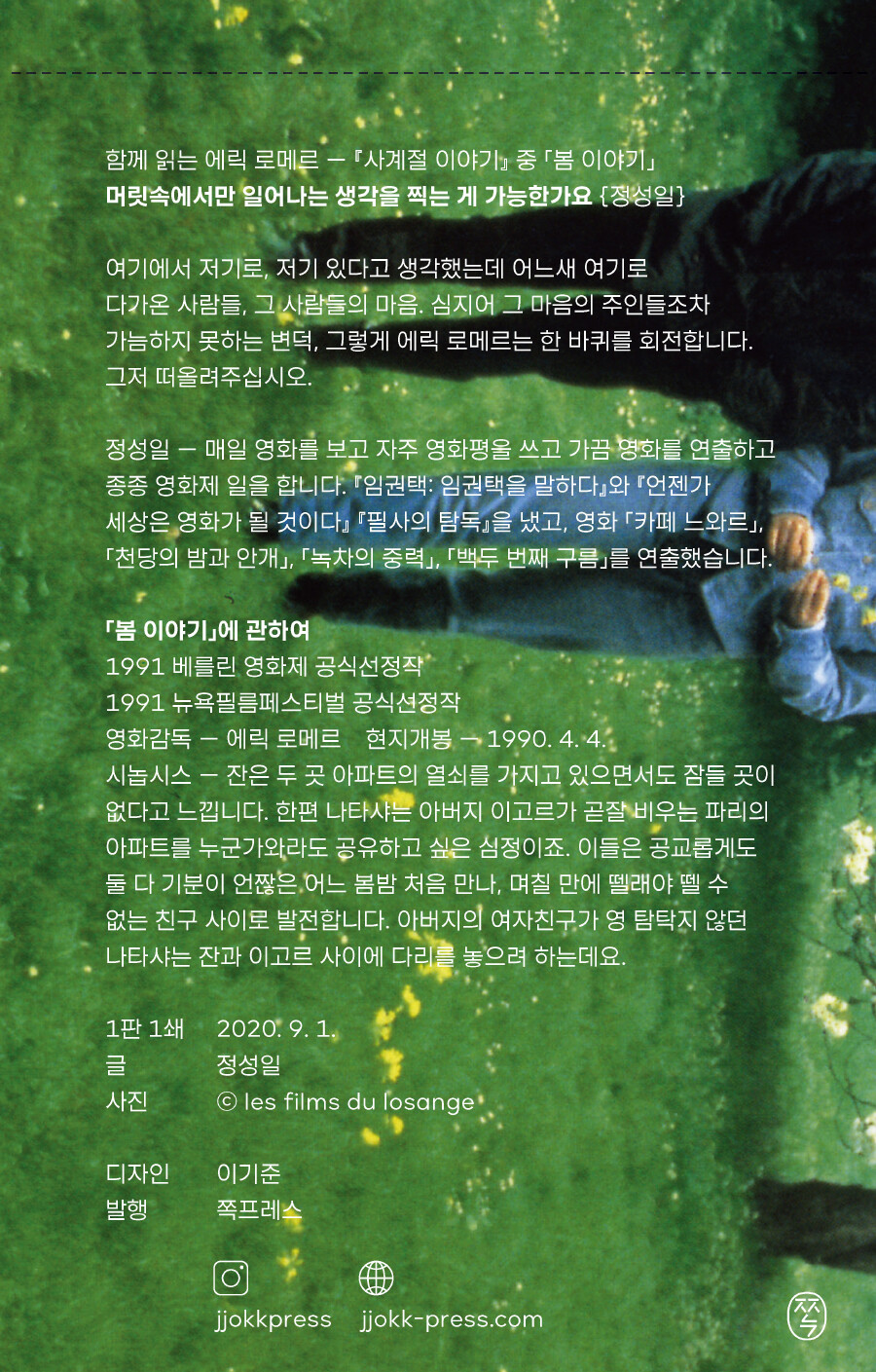 “이때 변덕은 더도 덜도 아닌 봄의 감흥입니다. 아마도 무겁고 두터운 겨울과 금방 모든 일에 지쳐버리게 만드는 여름 사이에서 벌어지는 계절의 이야기이기 때문일 겁니다. 이때 방점은 바로 그 사이, 에 놓여 있습니다. 여기에서 저기로, 저기 있다고 생각했는데 어느새 여기로 다가온 사람들, 그 사람들의 마음. 심지어 그 마음의 주인들조차 가늠하지 못하는 변덕, 그렇게 에릭 로메르는 한 바퀴를 회전합니다. 그저 떠올려주십시오.” ㅡ정성일(영화평론가)