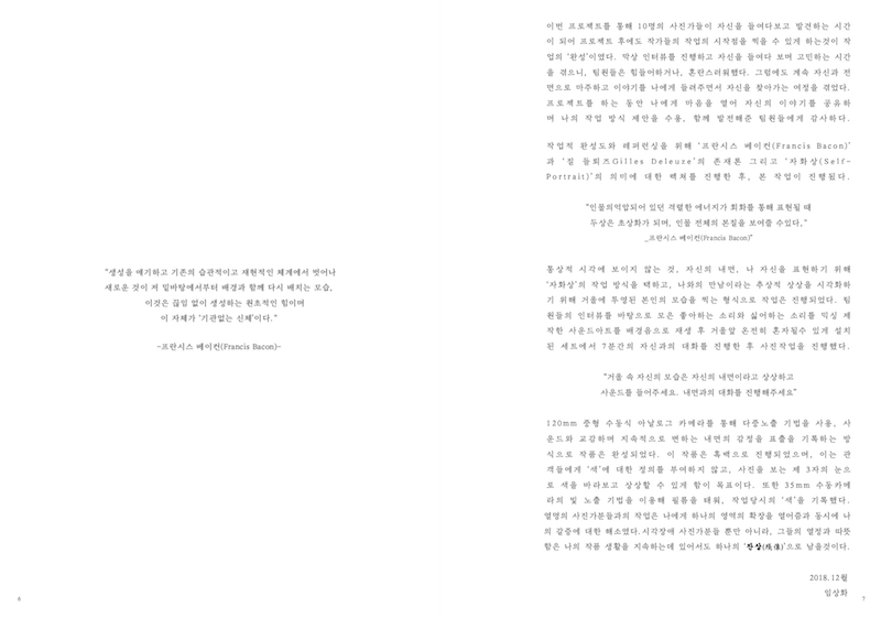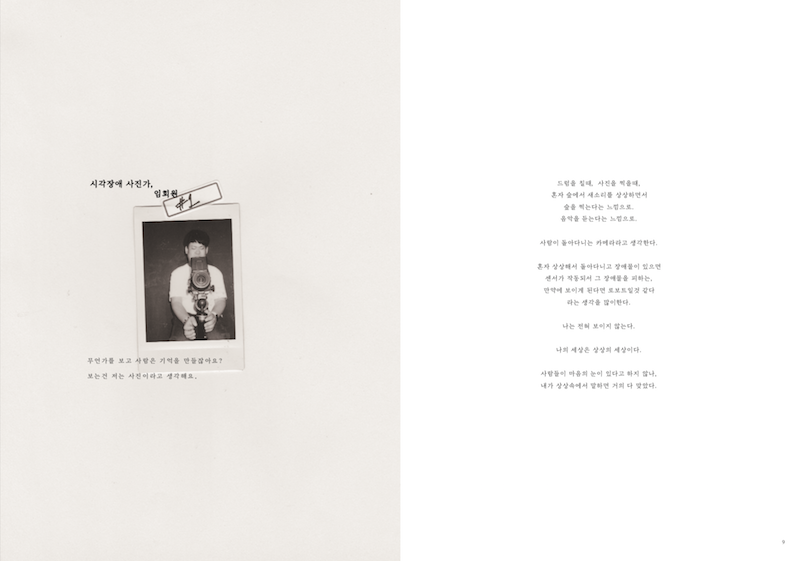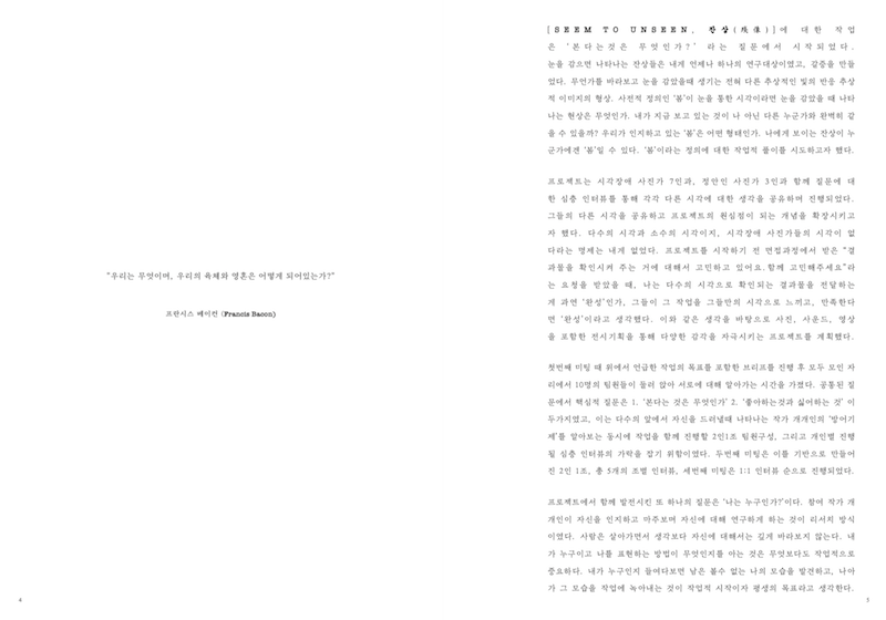 무언가를 바라보고 눈을 감았을때 생기는 전혀 다른 추상적인 빛의 반응 추상적 이미지의 형상. 사전적 정의인 ‘봄’이 눈을 통한 시각이라면 눈을 감았을 때 나타나는 현상은 무엇인가. 내가 지금 보고 있는 것이 나 아닌 다른 누군가와 완벽히 같을 수 있을까? 우리가 인지하고 있는 ‘봄’은 어떤 형태인가. 나에게 보이는 잔상이 누군가에겐 ‘봄’일 수 있다. ‘봄’이라는 정의에 대한 작업적 풀이를 시도하고자 했다. 다수의 시각과 소수의 시각이지, 시각장애 사진가들의 시각이 없다라는 명제는 내게 없었다. 그들의 다른 시각을 공유하고 프로젝트의 원심점이 되는 개념을 확장시키고자 했다.'