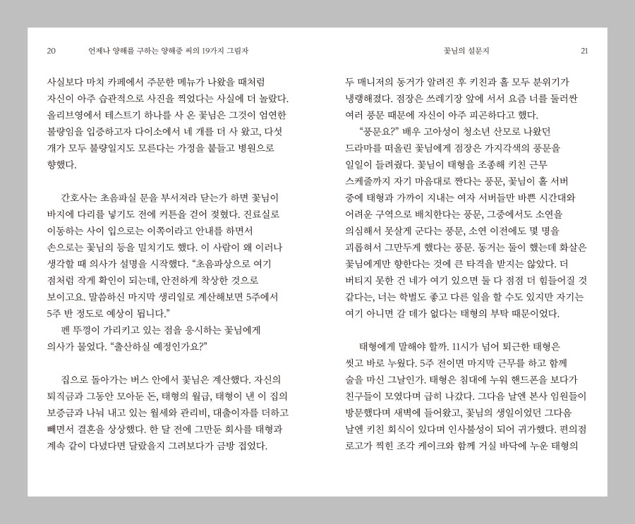 『언제나 양해를 구하는 양해중 씨의 19가지 그림자』는 타인의 삶에 남긴 양해의 몇 마디를 통해 ‘양해중'이라는 인물을 짐작해보는 19편의 연작 소설입니다. 양해중 씨가 때마다 내린 결정 및 이로 인해 구하게 된 양해와 직・간접적으로 연결된 사건들 속에 한 사람이 가질 수 있는 여러 형태의 그림자를 비춰봅니다.