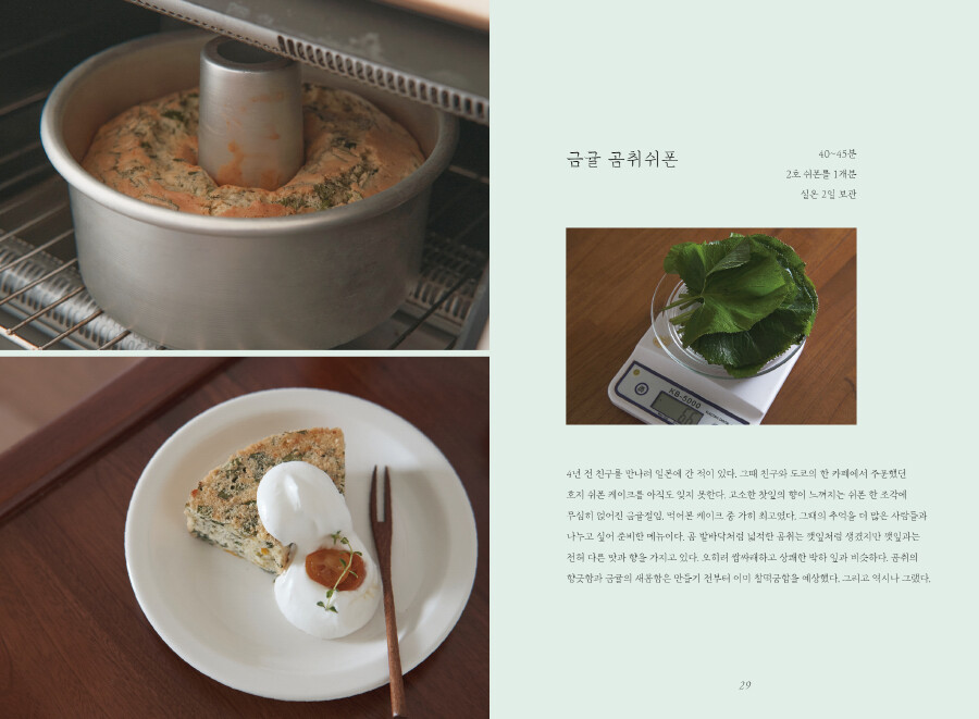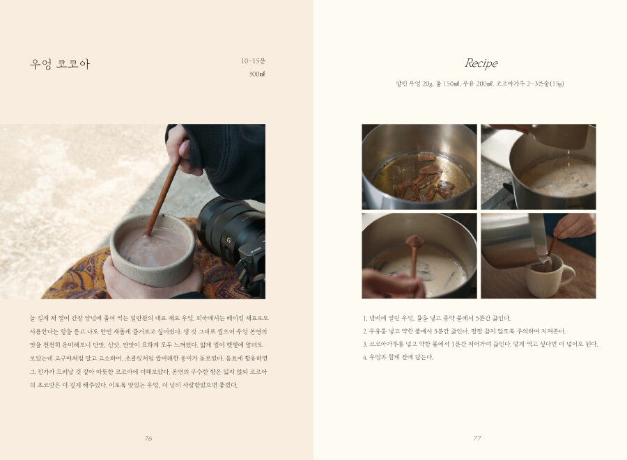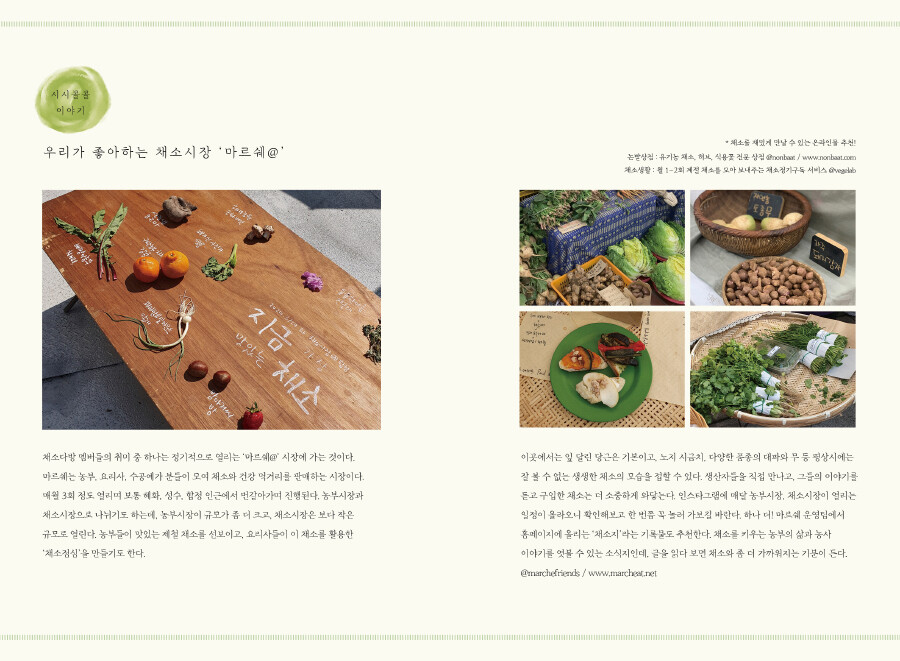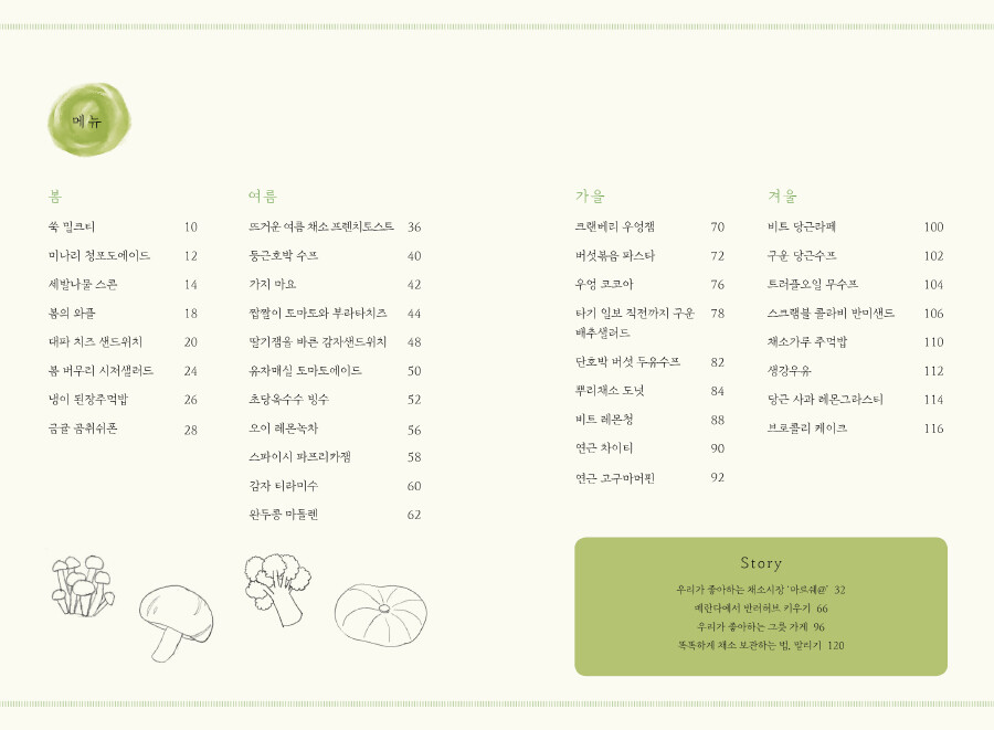 봄에는 짭조름한 세발나물로 소금 없이 스콘을 굽고, 쑥의 향긋함을 밀크티에 담았습니다. 여름에는 파프리카의 달콤함을 잼에 저장하고, 제철에만 맛볼 수 있는 초당옥수수로 달콤한 빙수를 개발했죠. 가을에는 우엉의 구수한 맛을 코코아에 우려내고, 뿌리채소를 반죽에 넣어 도넛으로 튀겨 보았고요. 겨울에는 구운 당근으로 따끈한 주황빛 수프를 만들고, 감기가 뚝 떨어질만한 알싸한 생강우유를 끓여보았답니다. 채소의 색다른 면이 독자님들에게 닿길 바라며 개발한 메뉴들이랍니다. <채소다방>에서 소개하는 메뉴들을 맛보며 채소와 조금 더 친해져 보는 건 어떨까요?