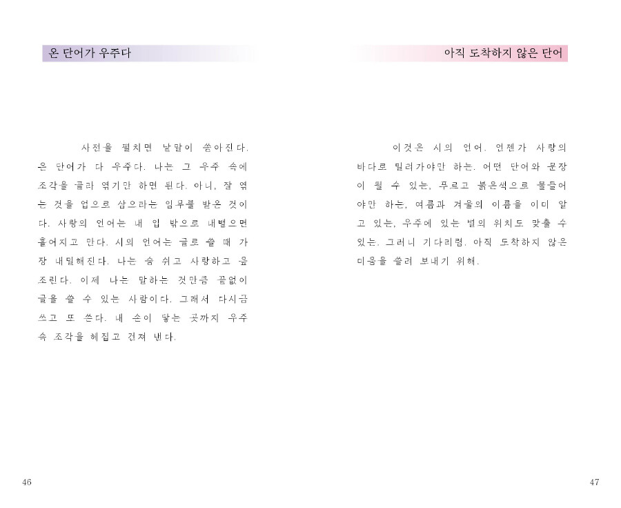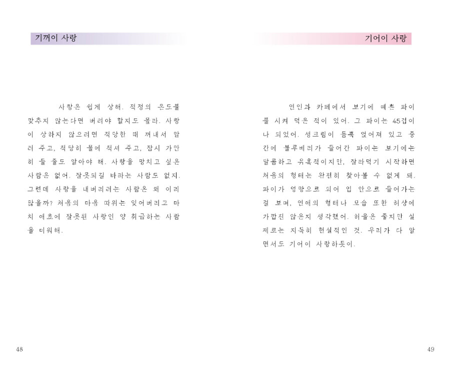 되었습니다. 기존에 써온 저의 이야기 대신 보편적인 모두의 이야기를 가지고, 시의 언어와 사랑의 언어를 빌려 썼습니다.