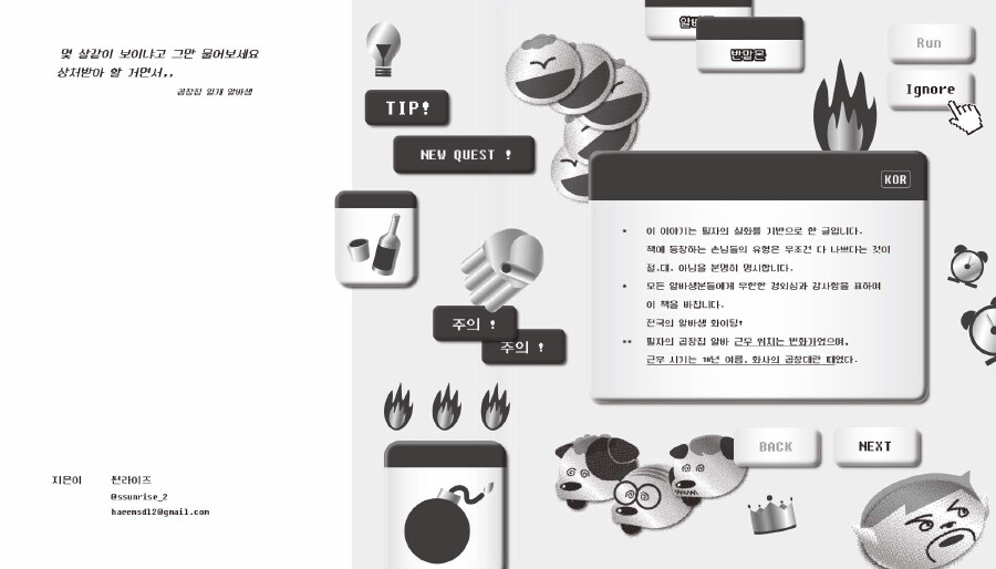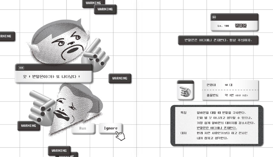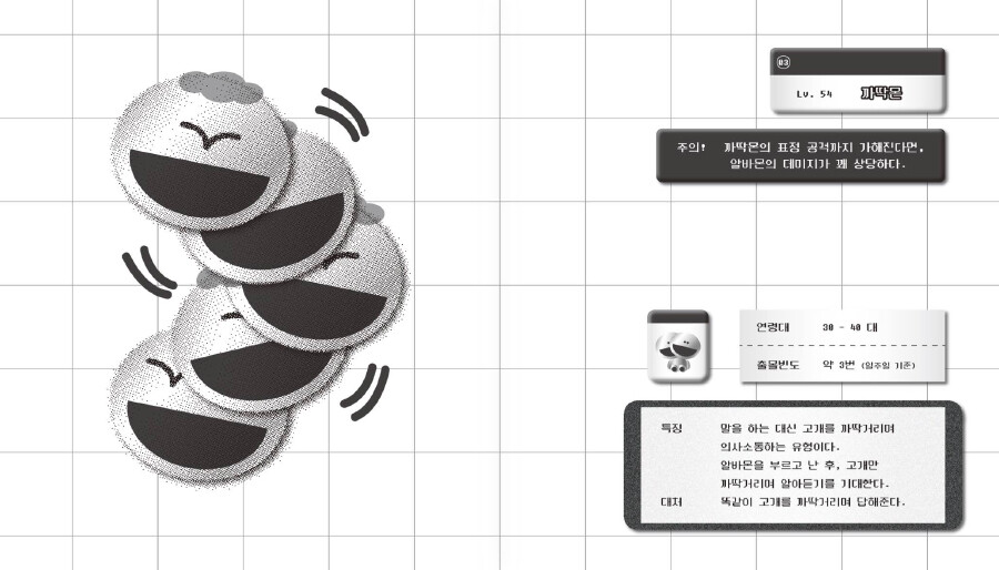 <별종도감>은 20살부터 시작해온 다양한 아르바이트 경험 속에서 만난 여러 유형의 별종(a.k.a.진상)을 도감 형식으로 엮어낸 짧은 그림책입니다. 많은 아르바이트를 하면서 별별 사람들을 만나고, 별별 문제 를 해결해야 하는 상황이 오기도 하는데요. 많은 사람들이 공감할 이런 일화들을 담아내었습니다.