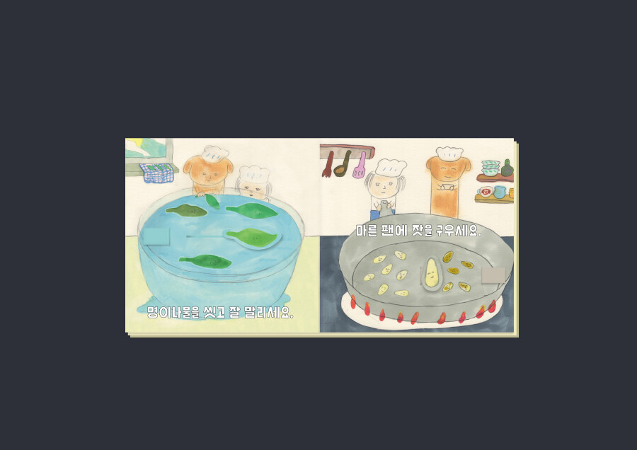 재료 준비부터 완성까지 페이지마다 귀여운 두 쉐프가 안내하는 조리 단계가 펼쳐집니다.