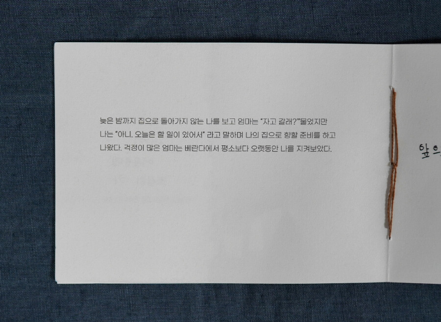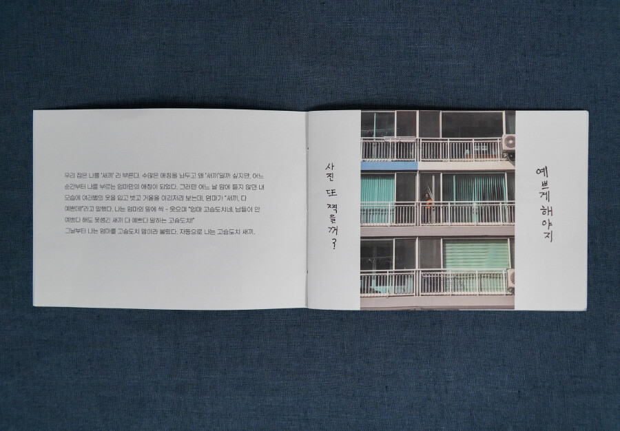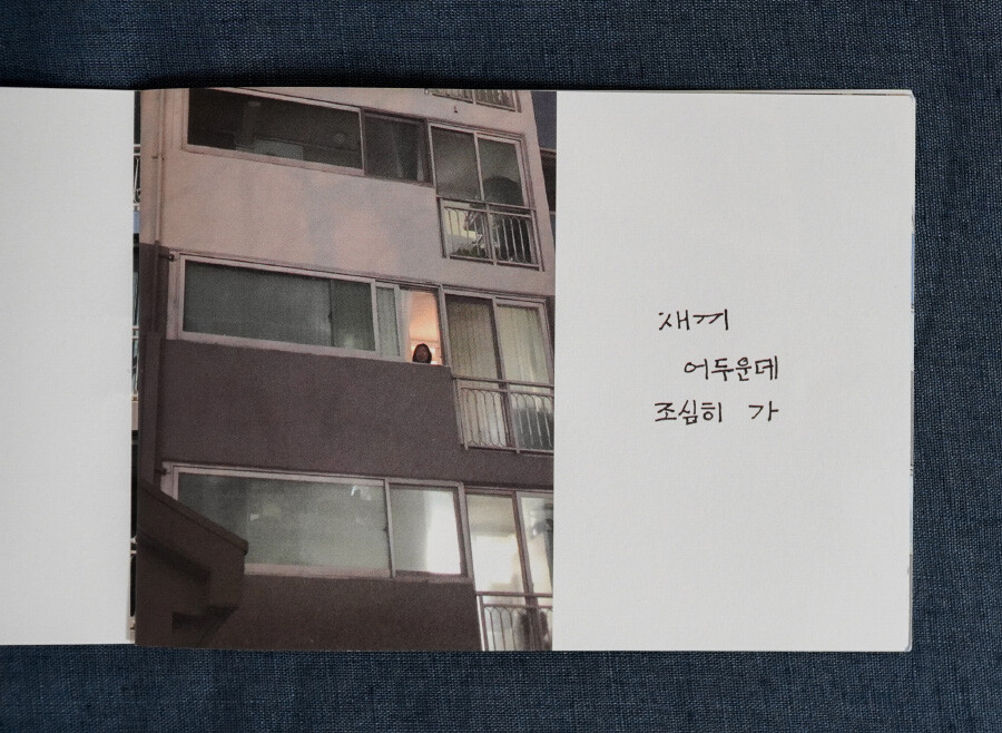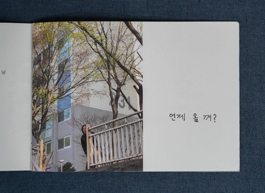 오른쪽에는 엄마가 베란다 마중을 한 모습과 엄마의 말이 손글씨로 담기고, 뒷 장에는 엄마의 마중을 받으면서 느꼈던 제 마음에 대해 남겼습니다. 계절에 따른 베란다 마중 사진을 넘기면서 ‘마중’의 순간을 느껴보기를 바랍니다.