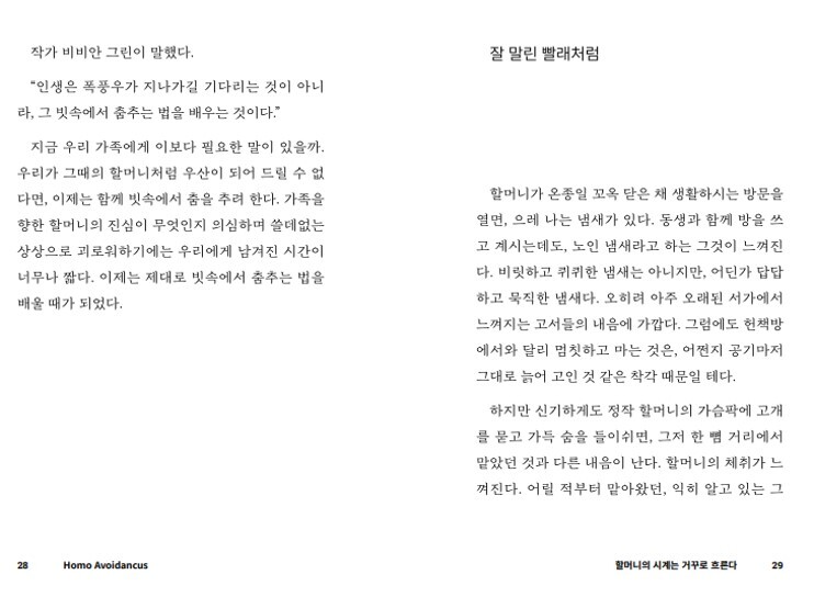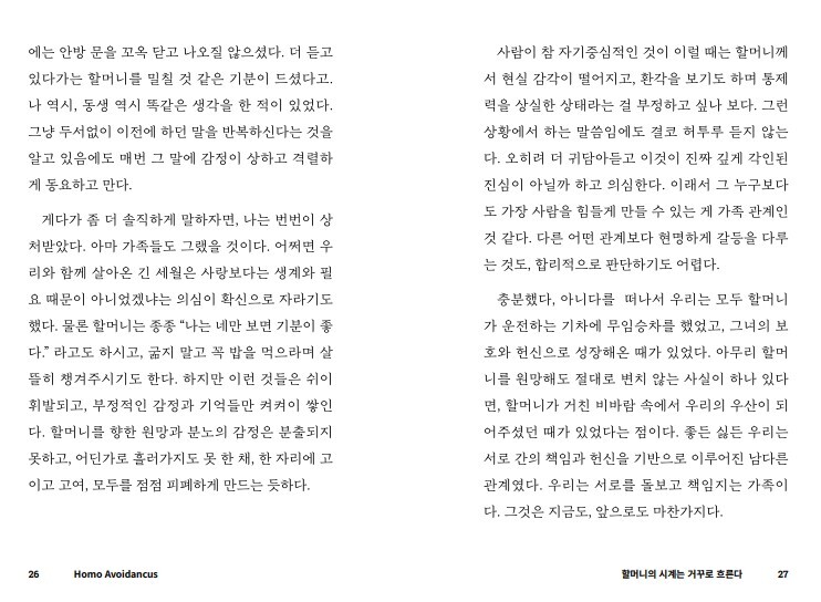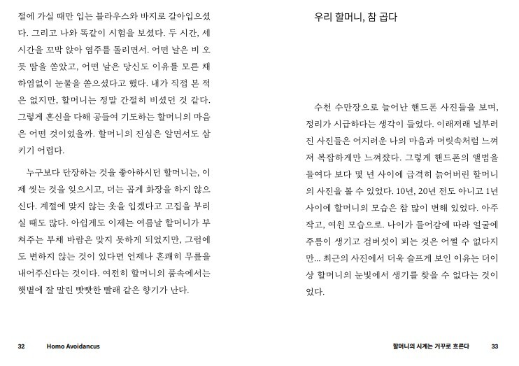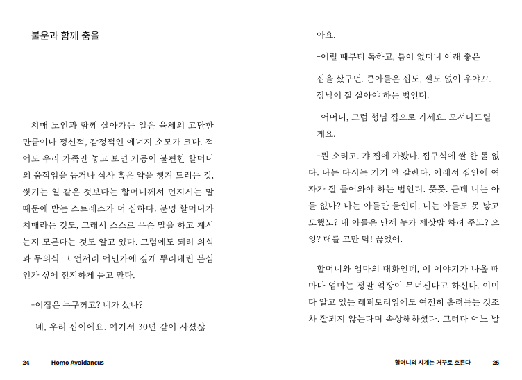 저는 퇴근을 하고, 가족들과 함께 저녁을 먹습니다. 치매에 걸리신 할머니를 간병하느라 힘들었을 엄마의 하루 일과를 듣고, 저마다 각자의 직장에서 겪었던 일들에 대해 이야기도 합니다. 오늘도 화장실을 찾아 헤매는 할머니께 화장실이 어딘지 알려 드리고, 옷을 갈아 입힌 후 주무시게 합니다.(물론 낮과 밤의 구분이 명확하지 않아서 쉬이 잠들지 않으시지만요!) 당신이 오늘 집에 돌아가 홀로 혹은 가족들과 함께 하는 일상과 크게 다르지 않습니다. 그럼에도 치매 노인과 함께 사는 일은 생각보다 버겁고, 가족 모두를 무기력하게 만듭니다. 치매약을 통해 나빠지는 속도를 늦출 수 있을 뿐, 점점 더 많은 것들이 버거워진다는 사실은 변하지 않거든요. 시간이 지날수록 할머니와 함께 했던 좋은 기억들마저 서서히 희미해지고, 이내 슬픔과 원망으로 변질되고 맙니다. 그래서 더 늦기 전에 마구잡이로 떠올랐다 사라지는 감정과 생각들을 글로써 차분하게 풀어보고 싶었습니다.