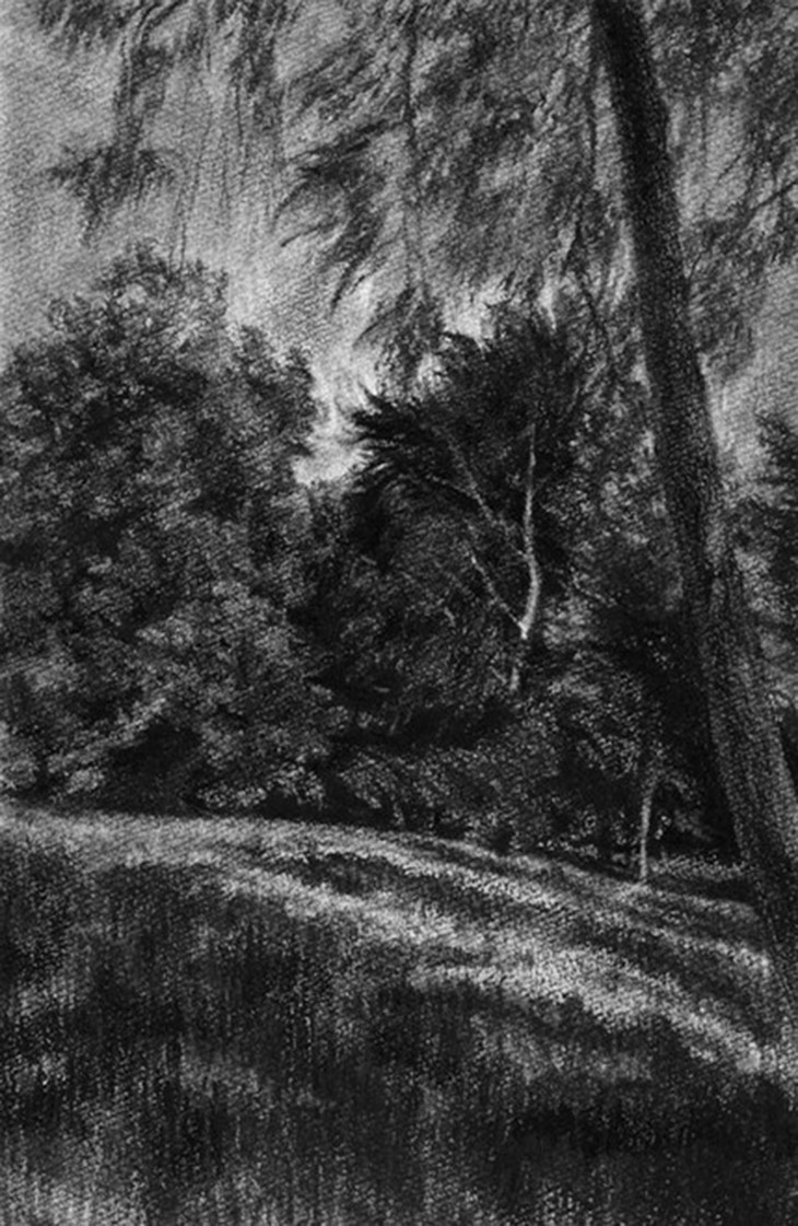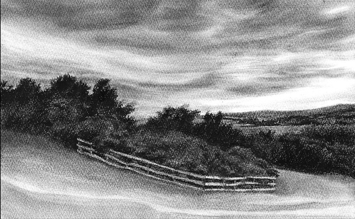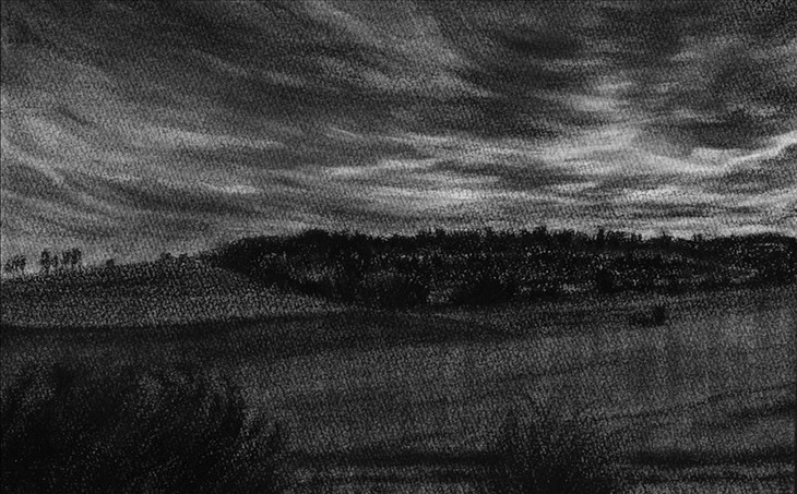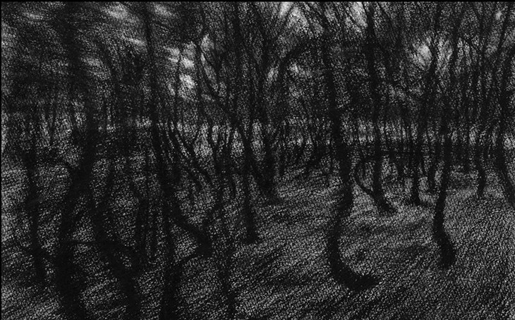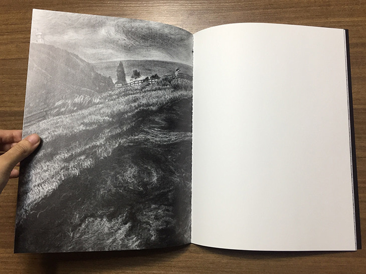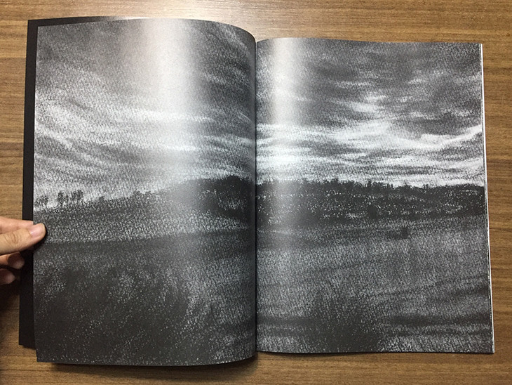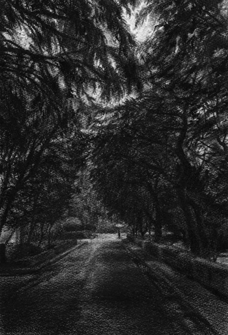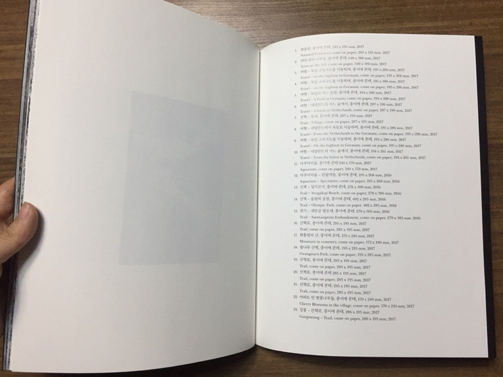 검정색의 콘테와 흰색의 종이. 이 둘이 만나는 경계에는 제목처럼 '희미하게 반짝이는' 어둠이 엷은 빛과 함께 흐릅니다. 동시에 그림 속에서 대상을 분명하게 구분짓거나 모호하게 아우르고 있습니다. 대비되는 이러한 두 가지 요소를 통해 시간의 흐름 가운데 포착했던 기묘한 순간들을 담아보았습니다.