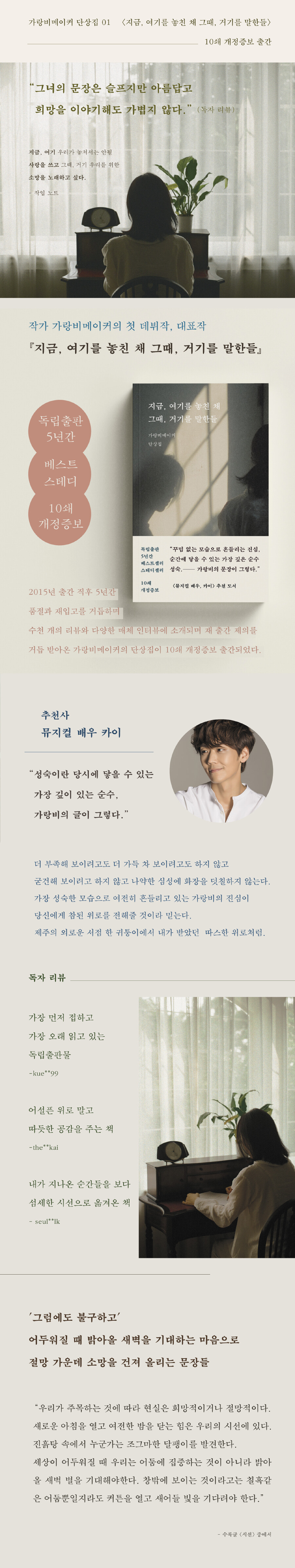 지금, 여기 순간을 스치는 감정과 깊은 사유를 담담히 풀어낸 단상집 『지금, 여기를 놓친 채 그때, 거기를 말한들』은 2015년 출간 직후부터 5년간 품절과 재입고를 거듭하며 동네책방 베스트, 스테디셀러로 등극했다. 수천개의 리뷰와 다양한 매체 인터뷰, 거듭된 재 출간 제의 등을 통해 가랑비메이커의 첫 데뷔작은 대표작이 되었다. 담담하지만 깊이 있는 문체로 수많은 이들의 공감을 받아온 이야기에 더욱 깊어진 5년간의 새로운 문장들이 더해져 더욱 묵직한 개정증보판이 되었다. 첫 집필이 시작되었던 열일곱의 여름부터 스물여덟의 가을까지, 긴 시간이 흘렀지만 여전히 그늘이 있는 이들을 사랑하는 마음으로, 바로 지금, 여기를 충실하기 살기 위한 다짐으로 이야기를 시작하는 가랑비메이커의 새로운 처음으로 당신을 초대한다.