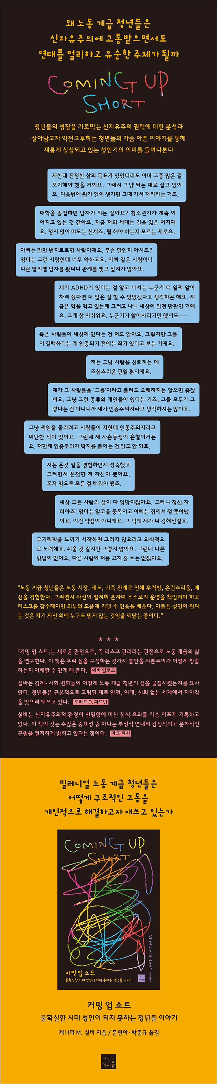 이 책의 제목인 ‘커밍 업 쇼트’(coming up short)는 ‘특정 기준이나 기대를 충족하지 못하는’이라는 의미로 사용되는 숙어다. 이 책에서는 특히 ‘성인이 되다’라는 뜻을 가진 coming of age와 대비를 이루며 청년들이 ‘성인’이라는 기준이나 기대를 충족하지 못하는 상황을 가리키는 표현으로 쓰이고 있다. 오늘날 노동 계급 청년들은 영원히 ‘수준 미달’인 채로 남을 운명에 처해 있다. 하지만 진짜 문제는 각 개인의 자아나 감정이 아니라 이들이 안정적으로 성인기에 도달하지 못하게 만드는 경제와 사회, 제도의 수준 미달이다.