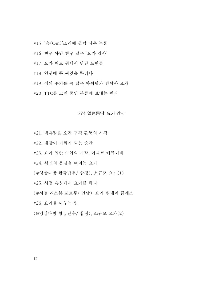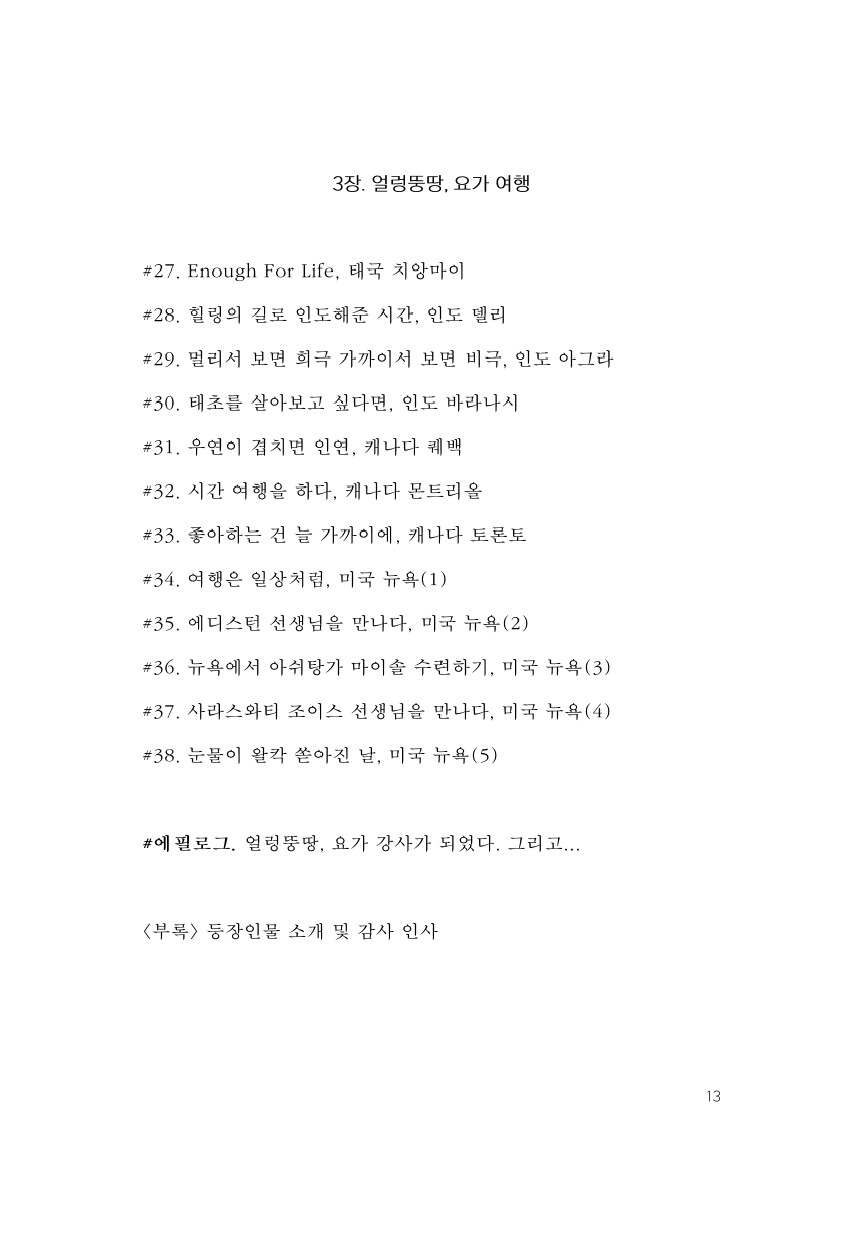 책은 크게 3장으로 나뉜다. 1장은 ‘얼렁뚱땅, 요가 지도자 과정(TTC)’으로 20주간의 TTC 이야기가 진행되며, 2장은 ‘얼렁뚱땅, 요가 강사’로 TTC가 끝난 뒤 요가 강사로서 활동한 저자의 고군분투기를 다룬다. 마지막 3장은 ‘얼렁뚱땅, 요가여행’으로 태국/ 인도/ 캐나다/ 미국 등 저자가 지금까지 다녀온 요가 여행지에서의 기록이 새겨져있다.