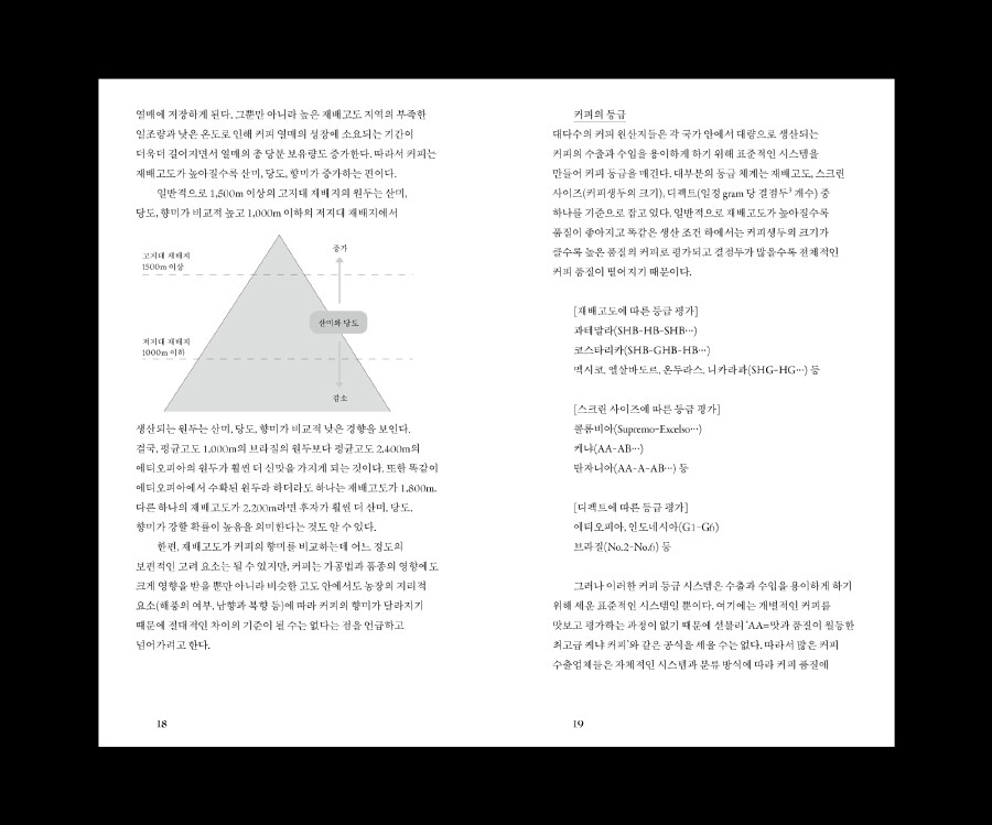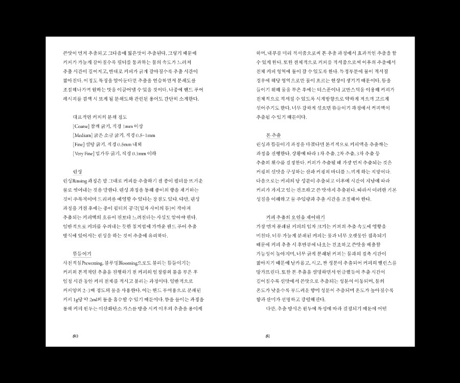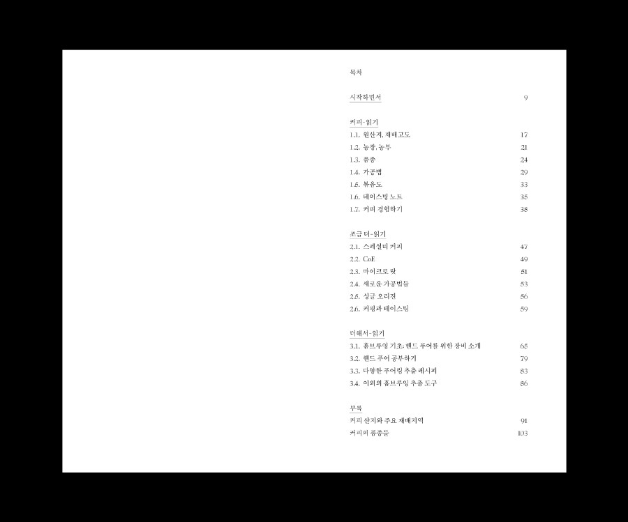 조금 더 깊게,조금 더 넓게 알아가기조금 더 전문적이고 다양한 내용들은 난해하지 않게, 챕터를 따로 분리해서 정리해두었습니다. 커피 트렌드, 전문 커피 컴피티션 등 커피를 둘러싼 다양한 이야기와 커피 지식 뿐만 아니라 직접 원두를 구매해 커피를 내려마실 독자들을 위한 홈브루잉 기초 지식과 관련된 내용도 <커피 읽기>에서 함께 소개합니다.