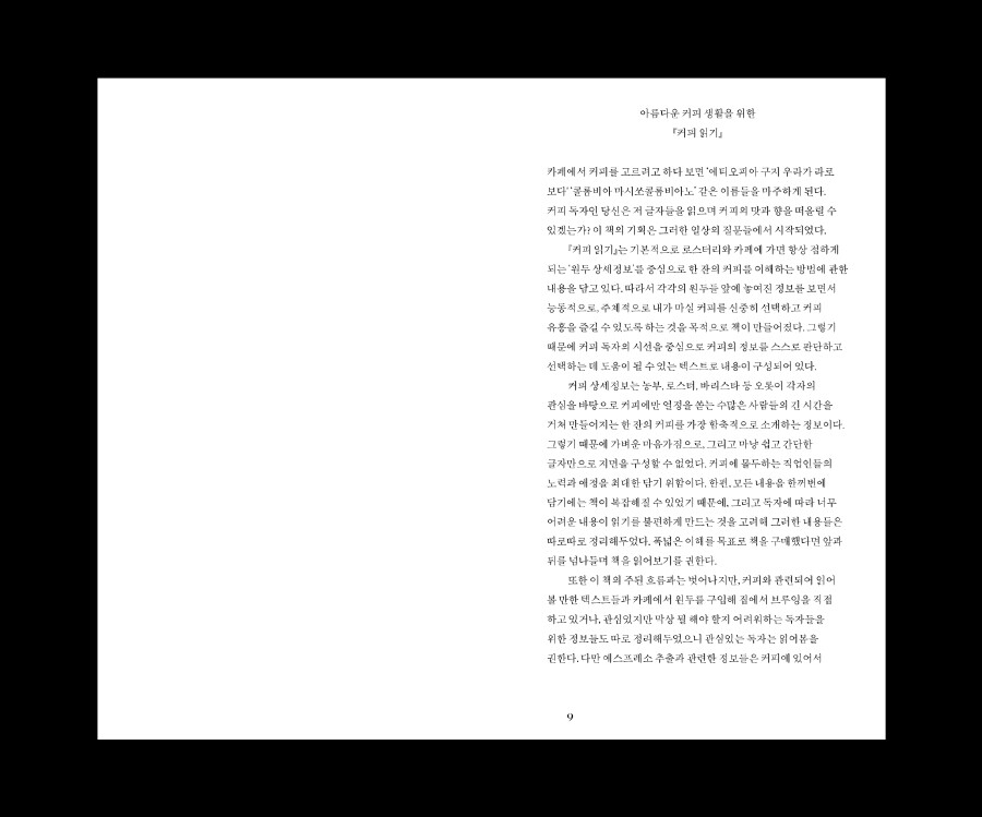 커피의 말을 읽어봅시다<커피 읽기>는 한 잔의 커피에 담긴 수많은 의미들을 커피의 말, 커피 정보를 중심으로 설명하고 소개하는 책입니다. ’농부' '농장' '고도' '품종' '가공법' '볶음도' '향미'와 같은, 커피 상세정보에서 볼 수 있는 여러 항목들에 담긴 의미들을 알기 쉽게 설명합니다. <커피 읽기>를 통해 독자들은 카페에서 커피 정보를 마주치더라도 당황하지 않고 주체적으로 텍스트를 읽어나가고 커피의 맛을 상상하면서 본인의 취향에 맞는 커피를 성공적으로 고를 수 있을 것입니다.