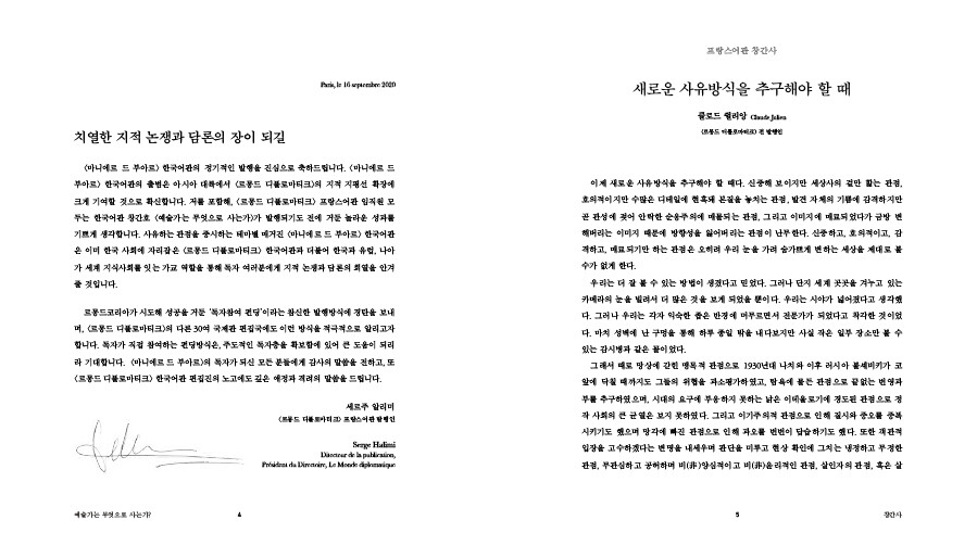 그리고 르몽드 코리아에서 2008년 10월에 창간하여 올해 만 13년을 맞이하게 되는 <르몽드 디플로마티크> 한국판은 빠른 속도로 지식인 사회의 필독지로 자리매김하며, 인권과 문화다양성을 보호하고 개혁과 변화의 가치를 존중하는 지성인과 민주시민의 벗이 되어왔습니다.