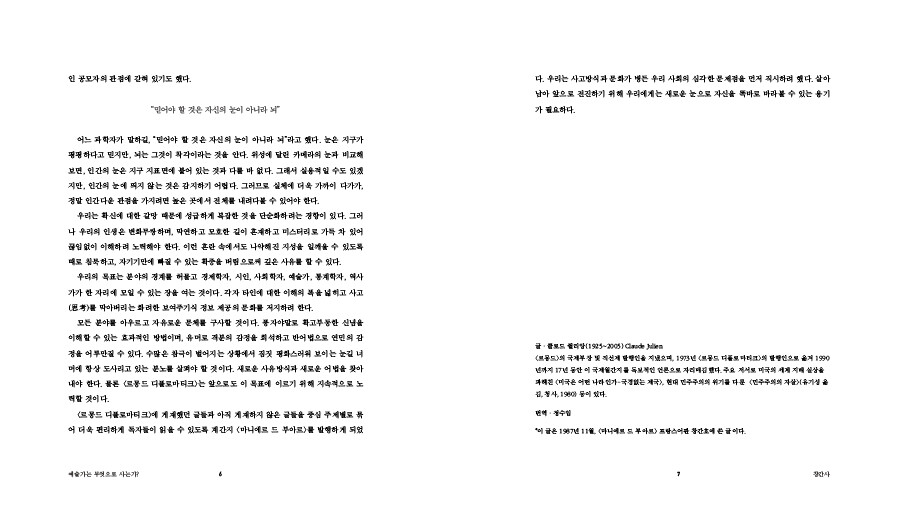 "어느 과학자가 말하길, “믿어야 할 것은 자신의 눈이 아니라 뇌”라고 했다. 눈은 지구가 평평하다고 믿지만, 뇌는 그것이 착각이라는 것을 안다. 위성에 달린 카메라의 눈과 비교해보면, 인간의 눈은 지구 지표면에 붙어 있는 것과 다를 바 없다. 그래서 실용적일 수도 있겠지만, 인간의 눈에 띄지 않는 것은 감지하기 어렵다. 그러므로 실체에 더욱 가까이 다가가,정말 인간다운 관점을 가지려면 높은 곳에서 전체를 내려다볼 수 있어야 한다." - 클로드 쥘리앙, p.6