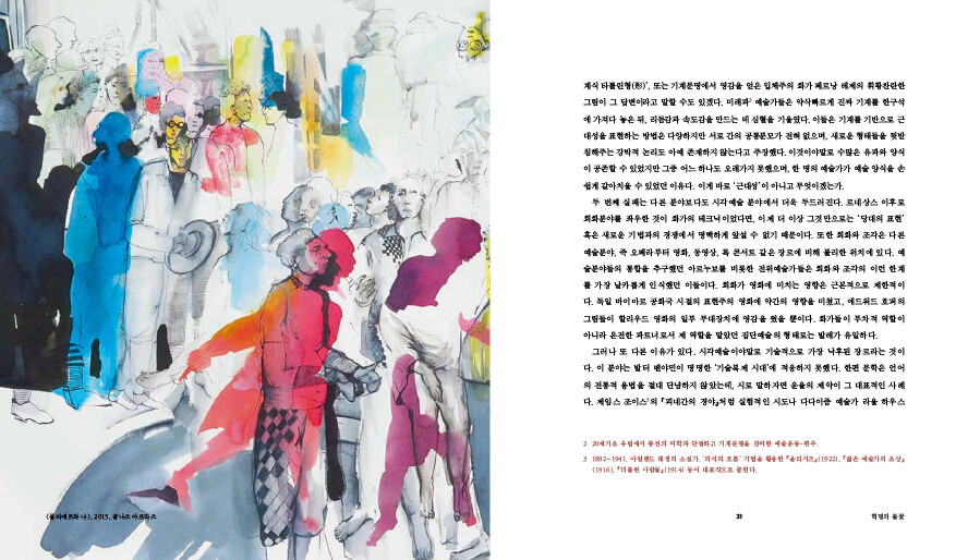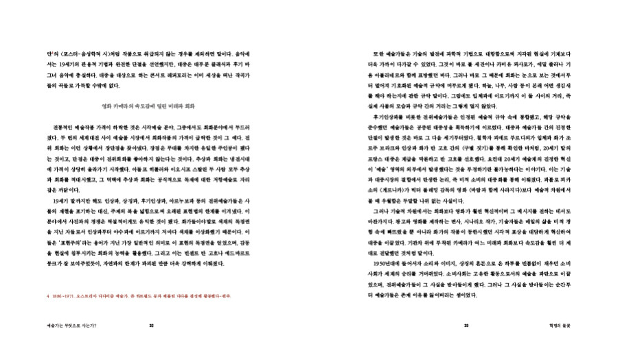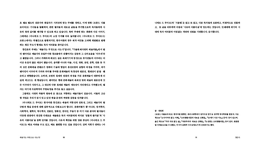 오히려, 오늘날은 모방과 복제와 반복의 과정을 거친 예술이 대중에게 더 깊게 파고들고 있는 듯합니다. 벤야민은 현대예술의 복제성 탓에 예술의 원본성에 깃든 아우라가 사라지고, 그 대신에 다량 복제된 예술의 세속성이 자리한다고 지적했습니다. 아티스트가 사회적으로 인정받는 이유는 ‘아티스트’라는 명칭 때문이 아니라, 세상의 유혹에 흔들리지 않고 자신만의 예술작품을 솔직하게 표현하기 때문일 것입니다. 듣기만 해도 가슴이 설레는 ‘아티스트’라는 단어가 돈벌이, 출세, 일탈의 발판으로 남용되는 현실에서, 우리 사회에 진정한 ‘아티스트다움’이란 무엇인지 곰곰이 생각해보고자 합니다.
