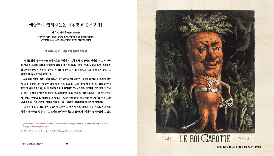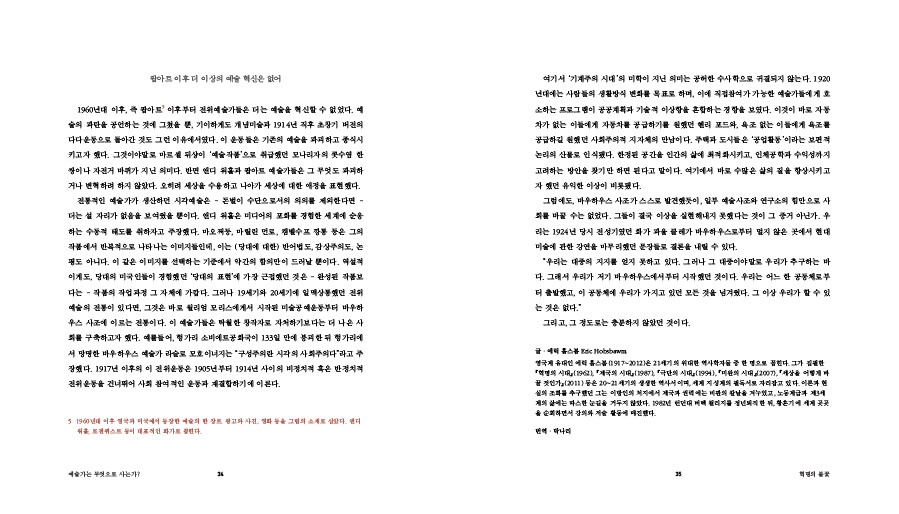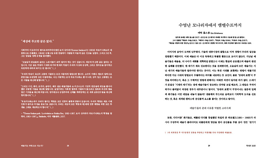 "현대예술은 혁명을 기치로 내건다. 고로 현대예술에 딴죽을 거는 자는 모조리 반동주의자가 되는 셈이다. 뼛속까지 반동인 문자 그대로의 반동주의자가 있다면 자신도 지각하지 못하는 잠재적 성격의 반동주의자도 있는데, 후자를 일컫는 말로 신반동주의자(NeoReactionist)가 있다. 이렇듯 현대예술을 표방하는 작품이나 활동에 의구심을 품었다가는 가차없이 ‘반동’이라는 꼬리표가 붙는 게 오늘의 현실이다. 이렇다 보니 현대예술 앞에 모두 입을 다무는 것도 놀랄 일은 아니다. 괜히 비평의 칼날을 들이댔다가 ‘우매한 대중’이라느니 ‘전문적 식견이 부족하다’느니 하며 문외한 취급을 받기가 십상이다. ‘당신은 반동주의자인가, 혁명주의자인가?’ ‘모더니티의 편인가, 아카데미즘의 편인가?’ 이런 식의 수사법은 아예 처음부터 모든 논쟁의 싹을 잘라버리는 데 탁월한 효과를 발휘한다." -·다니 로베르 뒤푸르, p.41