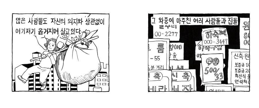 주거세입자가 크다면 크고 작다면 작은 보증금을 들고 이사갈 곳을 알아보러 다니면 원하든 원하지 않든 다른 이의 사는 공간으로 불쑥 들어가게 됩니다. 때로는 500에 20에, 때로는 1000에 45에, 때로는 6000에 적절하다고 평가된 삶과 공간에 드나드는 괴상한 경험을 반복하며 사람은 왜 이렇게 살아야 하는지 계속 생각했습니다.