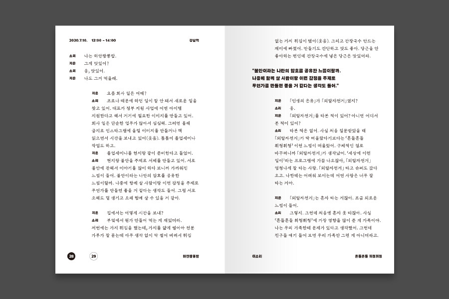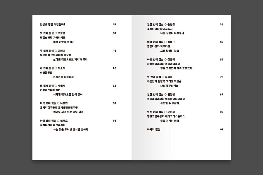 <열두 번의 점심, 열두 개의 은유>는 일 년 동안 함께 공부한 열두 명의 친구에게 각자의 ‘인생의 은유’를 묻고 그날 먹은 ‘점심 메뉴’와 함께 기록한 책이다. 오랜 시간 많은 걸 공유하면서 우린 하나라고 느꼈는데, 우린 딱 열셋이었다. 그런데 어떤 부분에서는 마치 한 사람처럼 같은 말을 하고 있었다.