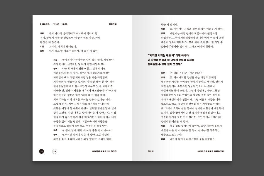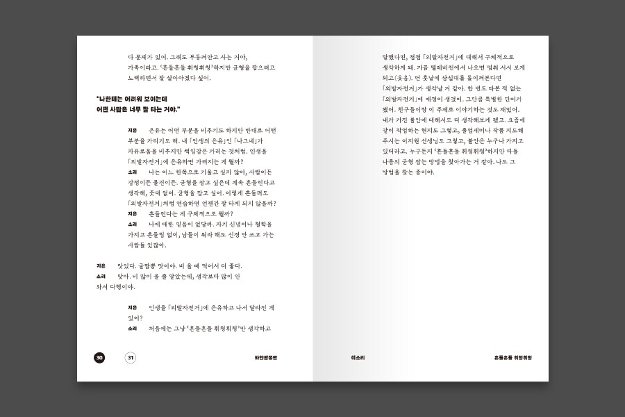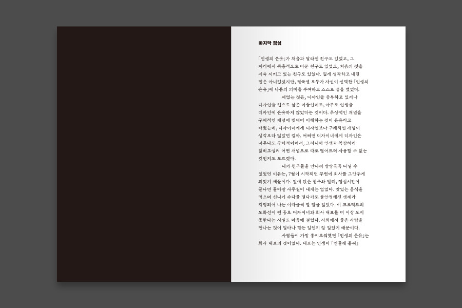 인생은 여행이라는데, 여행 회사에서 디자이너로 일해보니 아닌 것 같았다. 이십 대 동료 디자이너는 인생이 등산이란다. 사십 대 회사 대표는 인생이 민들레 홀씨라 했다. 삼십 대 내 인생은 나그네였다. 인생의 은유를 묻고 나서 나는 절대 이전과 같은 눈으로 그들을 볼 수 없었다.