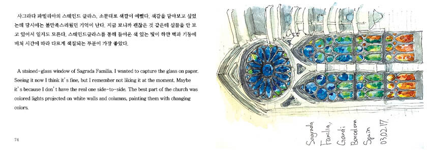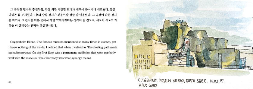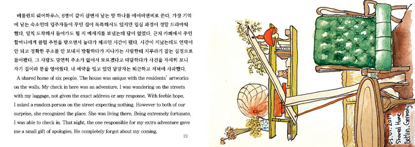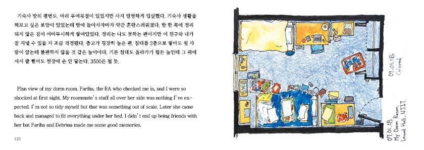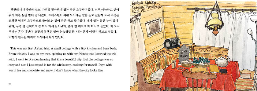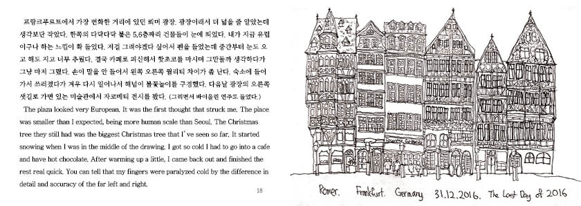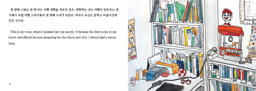 유럽여행과 미국 교환학생을 가서 그린 그림과, 관련된 짤막한 글로 구성되어 있습니다.